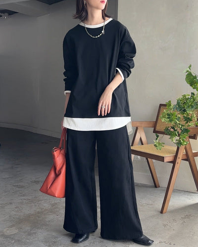 2点セット『 プルオーバー × パンツ 』 ポンチ生地 ■4月下旬入荷 レディース セットアップ トップス ボトムス チュニック ロング オーバー ライン 長袖 長い ワイド ワイドパンツ ストレッチ 体型カバー スポーティー 大きいサイズ 黒 ベージュ 春 夏 HUG.U