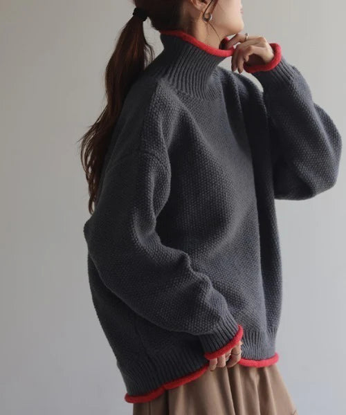 【冬SALE】 2025AW新作 ニット バイカラー リブ編み ■一部3月上旬入荷 レディース トップス セーター プルオーバー 長袖 配色 ボリュームスリーブ クルーネック サムホール リブ ストレッチ チクチクしない ゆったり 体型カバー 大きいサイズ お尻が隠れる カジュアル 黒 グレー 秋 冬 HUG.U