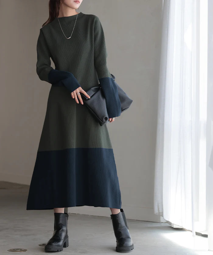ワンピース 「隠すよりメリハリ」 ニット ワンピ ■一部3月中旬入荷 Aライン レディース ニットワンピ ニットワンピース ロング ロングワンピ リブ きれいめ 長袖 ボートネック シンプル タイト 軽量 体型カバー 無地 伸縮性 グリーン 春 夏 HUG.U