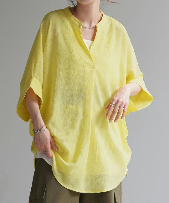 2026SS新作 シャツ スキッパーシャツ ■5月中旬入荷 ブラウス レディース トップス 半袖 Vネック 深Vネック 五分袖 襟付き バルーン ノンアイロン 体型カバー 大きいサイズ 着痩せ お尻が隠れる シワになりにくい オフィス きれいめ カジュアル 春 夏 ネイビー ブラック HUG.U