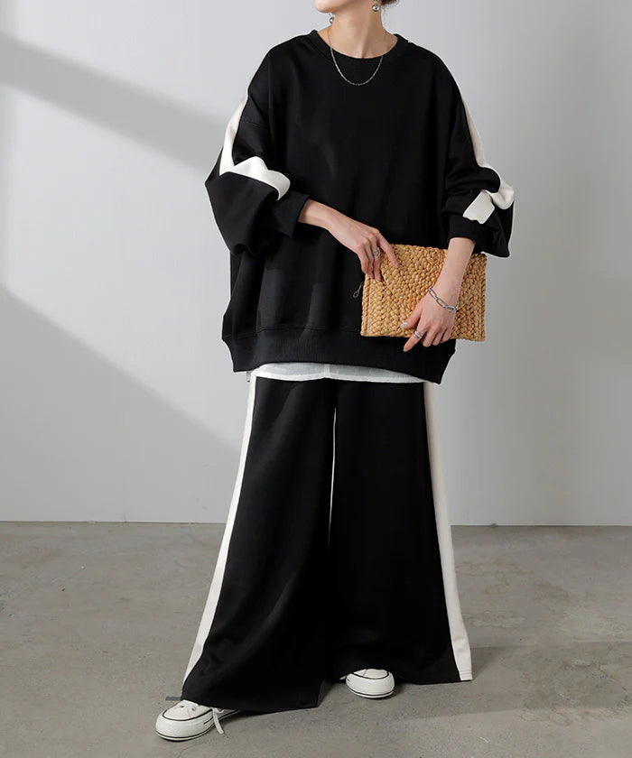 2点セット『 プルオーバー × パンツ 』 ポンチ生地 ■一部4月中旬入荷 レディース セットアップ トップス ボトムス チュニック ロング オーバー ライン 長袖 長い ワイド ワイドパンツ ストレッチ 体型カバー スポーティー 大きいサイズ 黒 ベージュ 春 夏 HUG.U