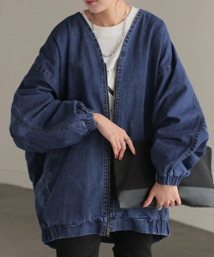 Gジャン ドルマン デニム アウター レディース ■4月下旬入荷 ジャケット デニムジャケット ロング 長袖 トップス ノーカラー Vネック お尻が隠れる ライトアウター コクーン チュニック 羽織 ジーンズ 無地 オーバー 大きいサイズ 体型カバー ブルー 黒 春 夏 HUG.U