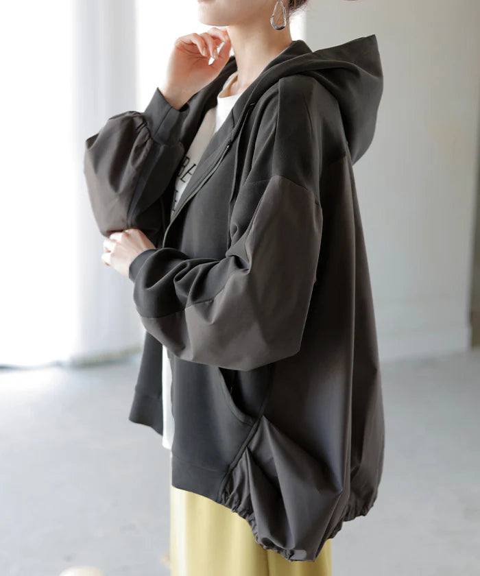 パーカー ポンチ シャツ スポーティー ■一部4月中旬入荷 アウター レディース チュニック 異素材 ライトアウター トップス ジップアップ フード フーディー ビッグ ゆったり オーバーサイズ 羽織 体型カバー 大きいサイズ お尻が隠れる グレー 黒 春 夏 HUG.U