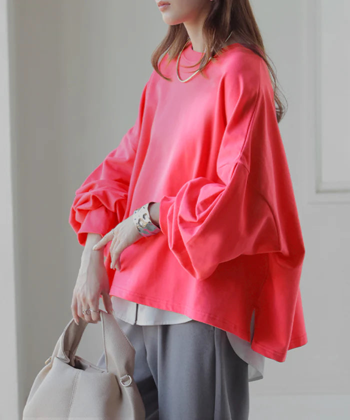2026SS新作 トップス 「Tシャツ以上スウェット未満」■4月下旬入荷 ロンT スウェット ジャスト丈 レディース プルオーバー 綿100% Tシャツ 長袖 トレーナー リブ ボリューム袖 カットソー 体型カバー スリット クルーネック 裏毛 重ね着 カジュアル グリーン ピンク 春 夏 HUG.U
