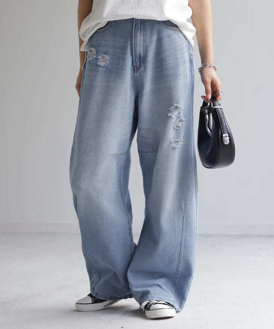 デニム お洒落 カーブパンツ デニムパンツ パンツ レディース タック カーブデニム ジーンズ ジーパン ボトム クラッシュ ゆったり ストレート ワイドパンツ 体型カバー ボトムス ズボン ハイウエスト 薄手 ゴム ワイド 大きいサイズ 春 夏 HUG.U