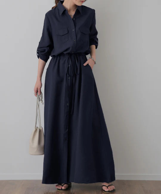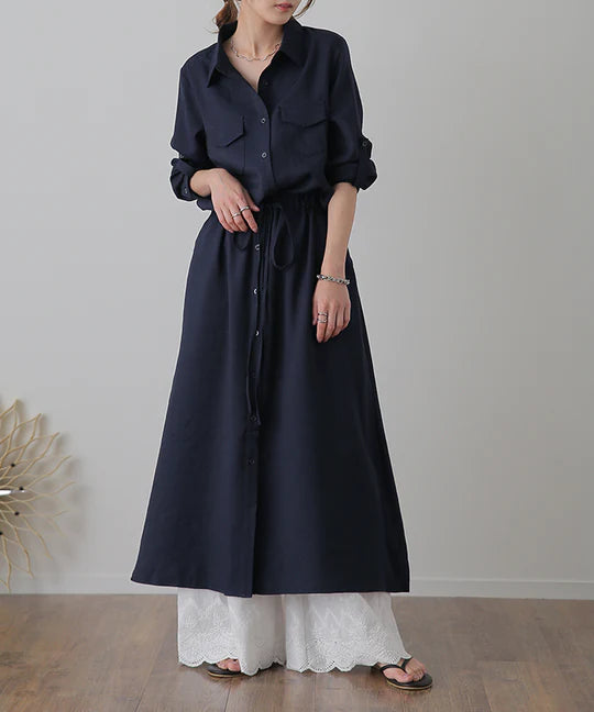 ワンピース 「理想の着痩せ」まくり袖で二の腕カバー ロングワンピース シャツ ブラウス ワンピ シャツワンピ ロング マキシ マキシワンピース レディース 長袖 羽織 大きいサイズ 黒 ベージュ きれいめ 春 夏 HUG.U