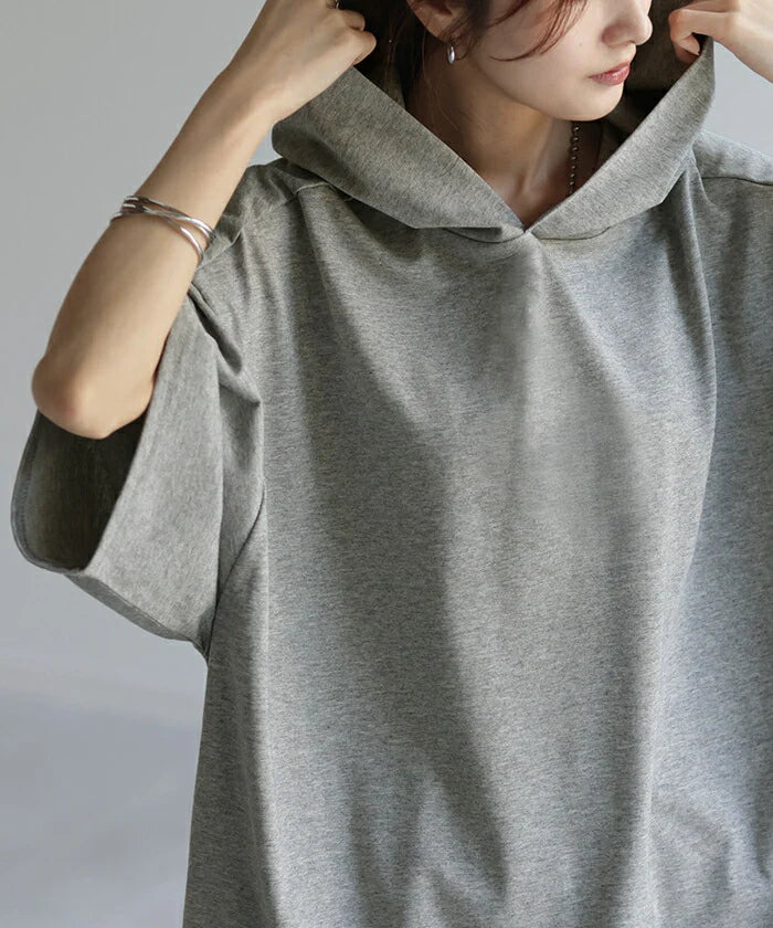 パーカー 綿100% 半袖 レディース トップス Tシャツ 無地 ロング 体型カバー 裏パイル 裏毛 コットン オーバーサイズ 七分袖 プルオーバー 二の腕カバー お尻が隠れる チュニック カットソー トレーナー フード 大きいサイズ 白 グリーン 春 夏 HUG.U