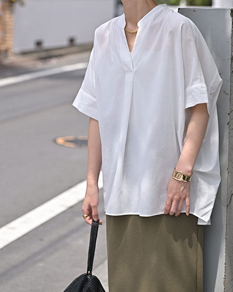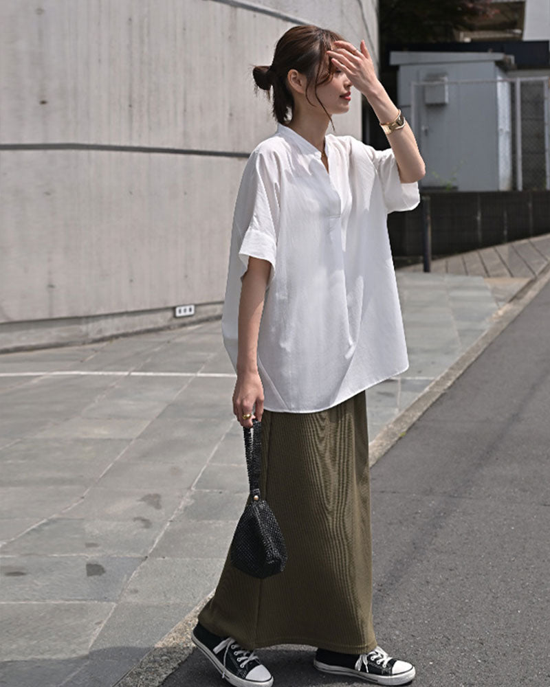 ほどよい落ち感が魅力のとろみブラウスと、すっきり美シルエットのオリーブタイトスカート。柔らかとシャープ、相反する表情をまとったこのコーデは、まさに“きちんと感”と“こなれ感”のいいとこ取り。オンもオフも品よく楽しめる、大人のベーシックです。