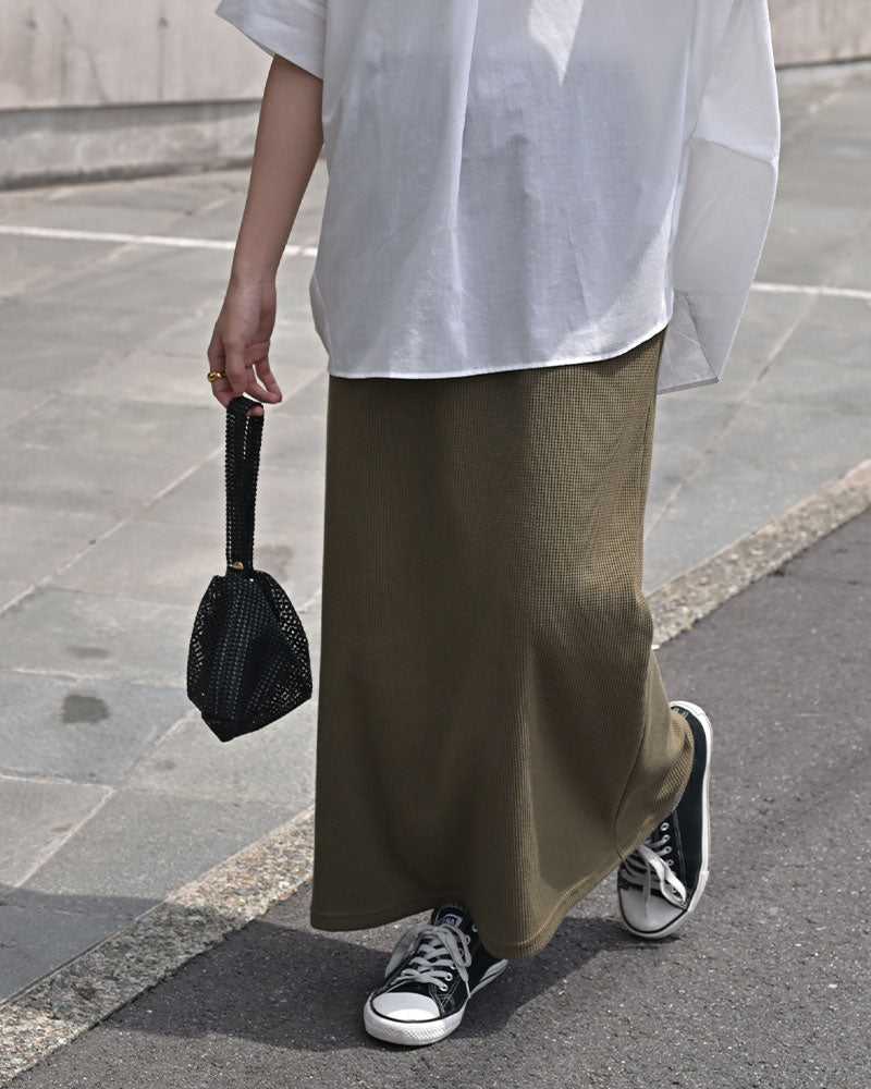 スカート ワッフル タイトスカート レディース ボトムス 無地 ナロースカート ストレッチ ウエストゴム 着痩せ Iライン ロング ロングスカート 裏地 マキシ 綿 混 別売り セットアップ 可 体型カバー ポケット 大きいサイズ 白 黒 春 夏 HUG.U