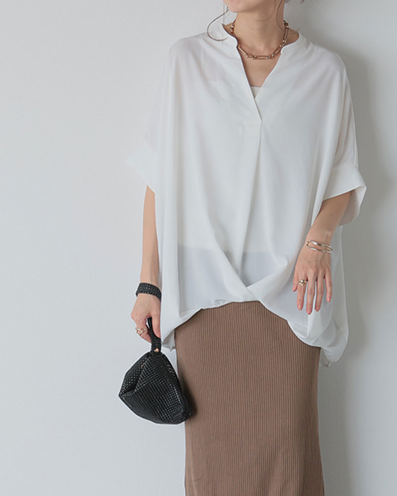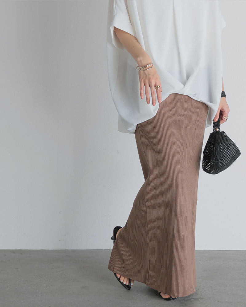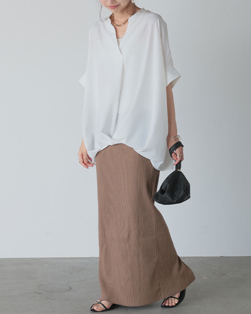 軽やかで肌離れの良いとろみシャツに、落ち着いたモカブラウンのタイトスカートを合わせた、夏のきれいめカジュアル。シンプルながら計算された配色とシルエットで、大人の余裕を感じさせる一着に。オンにもオフにも◎。