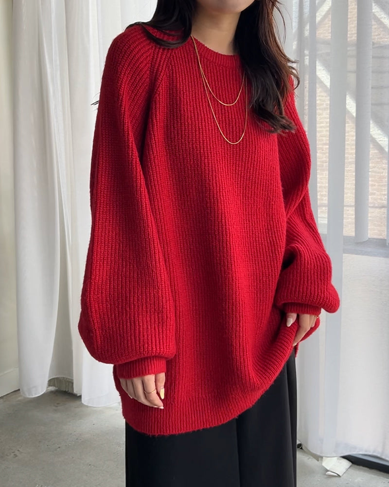 ニット ボリュームスリーブ ロング レディース トップス 長袖 無地 クルーネック ミックスカラー チュニック ロングニット お尻が隠れる チクチクしない セーター プルオーバー ドルマン ゆったり 大きいサイズ 体型カバー 赤 黒 春 夏 HUG.U