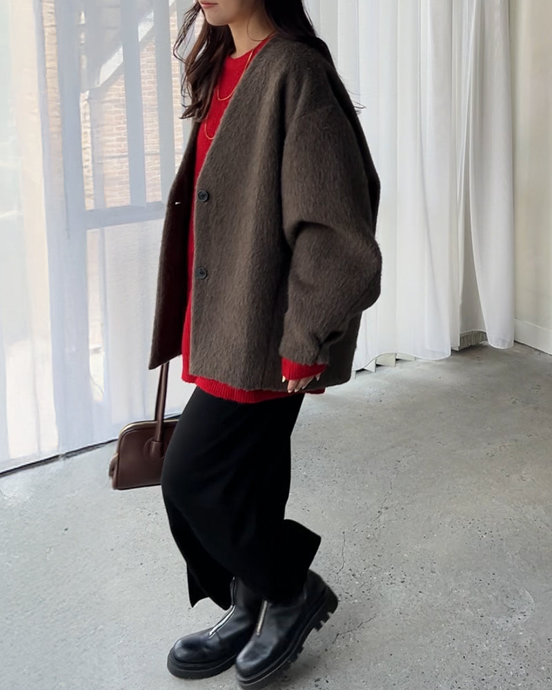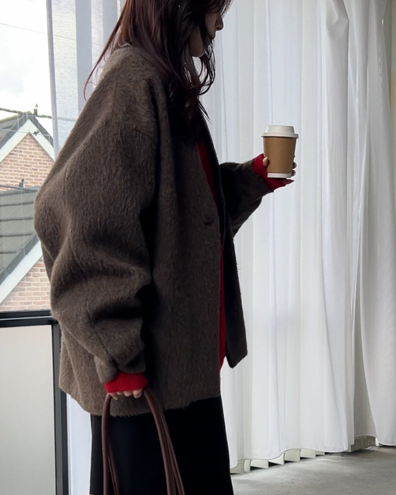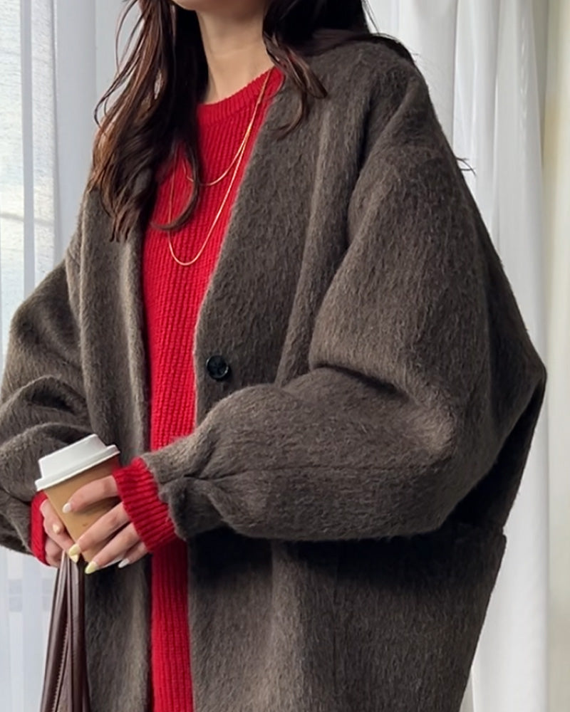 2025AW新作 コート ■一部11月中旬入荷 シャギー ドルマンスリーブ アウター レディース シャギーアウター Vネック ノーカラー ドルマン プルオーバー ロング 長袖 オーバーサイズ 大きいサイズ 重ね着 体型カバー 二の腕カバー きれいめ 防寒 黒 ベージュ 秋 冬 HUG.U