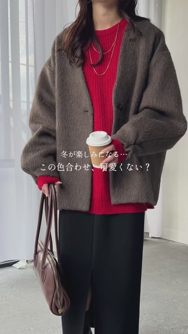 黒のタイトスカートに赤のニットを合わせ、ブラウンのシャギーニットを羽織った大人レディなスタイル。赤の華やかさを黒が引き締め、シャギーの質感が季節感とトレンド感をプラス。シンプルだけど上品に決まる、冬に映えるこなれコーデです。