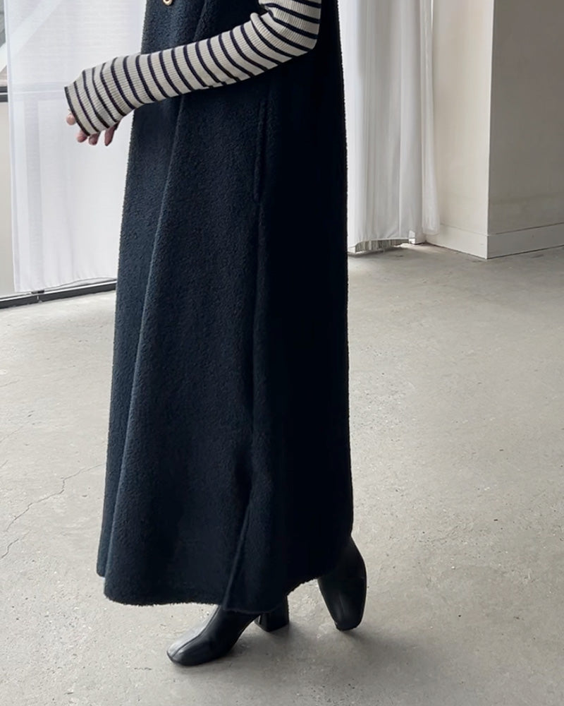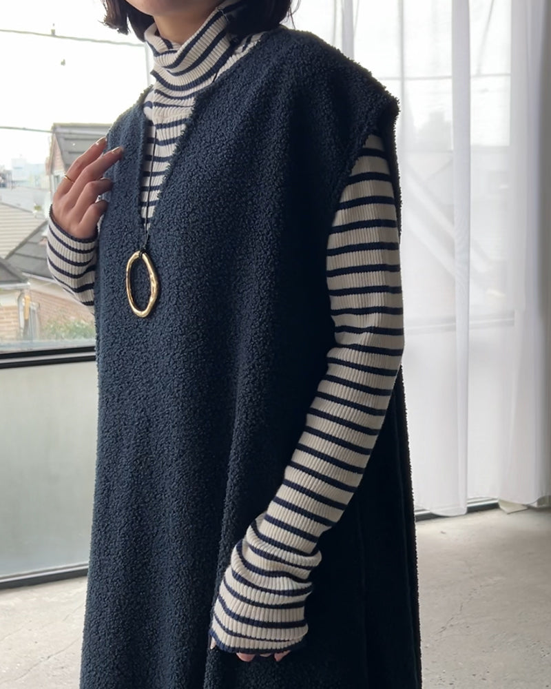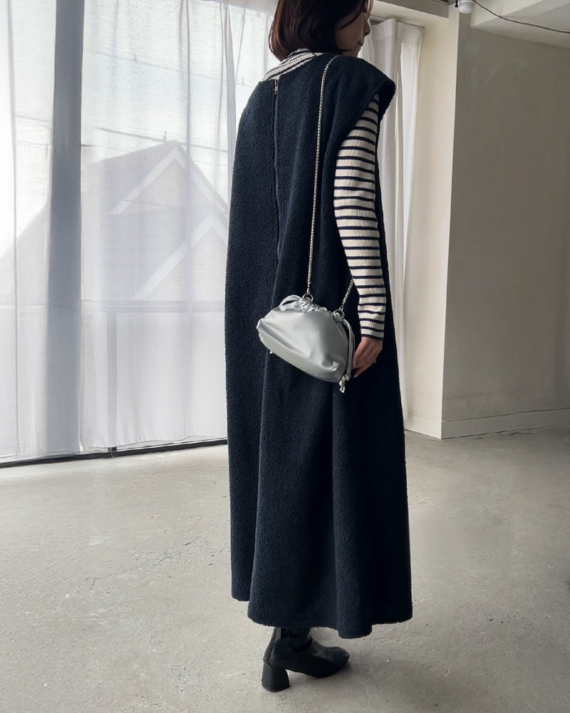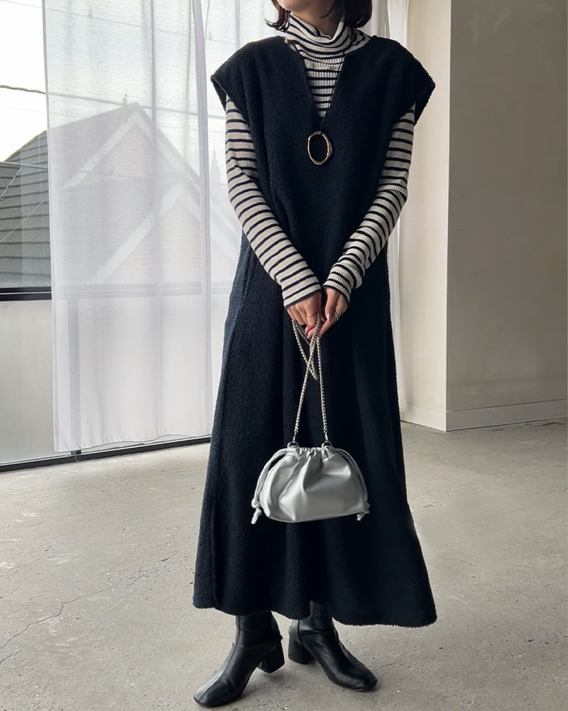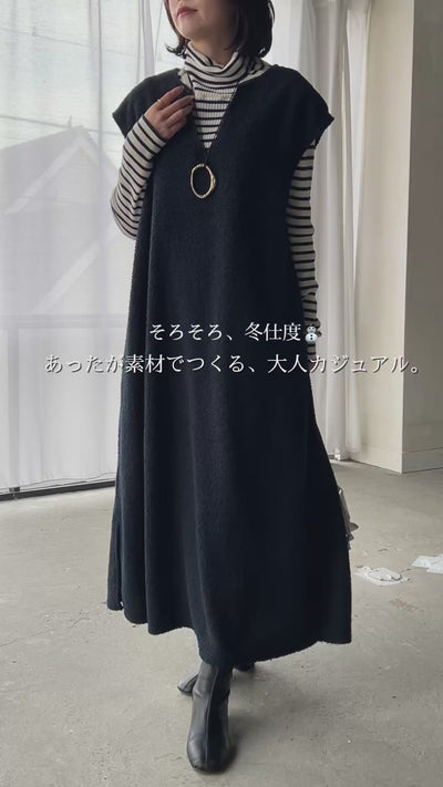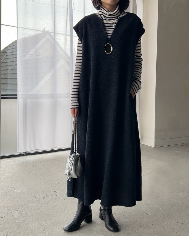 2025AW新作 ワンピース ボア 選べる 2丈 レディース Vネック ワンピース ロング ロングワンピース レイヤード Aライン マキシ マキシワンピース ワンピ ロングワンピ キーネック ノースリーブ 裏地 重ね着 体型カバー 大きいサイズ 無地 黒 グレー 秋 冬 HUG.U