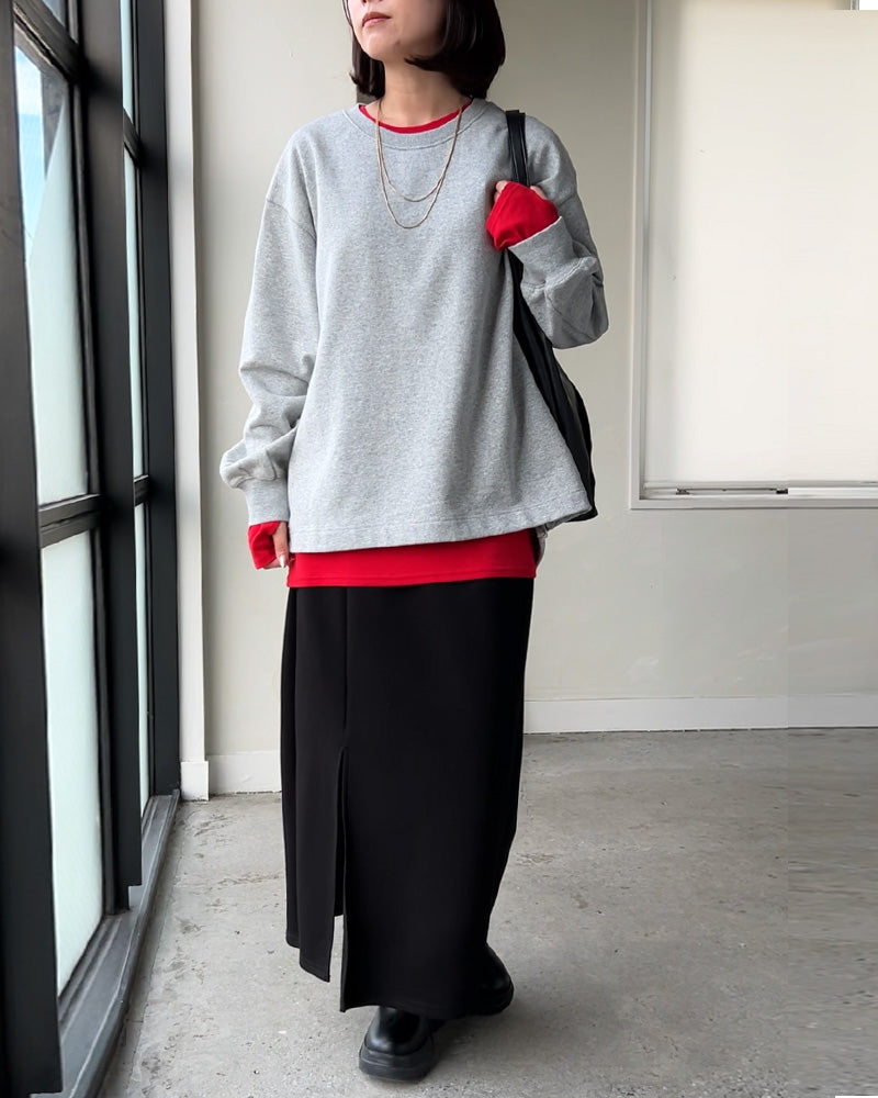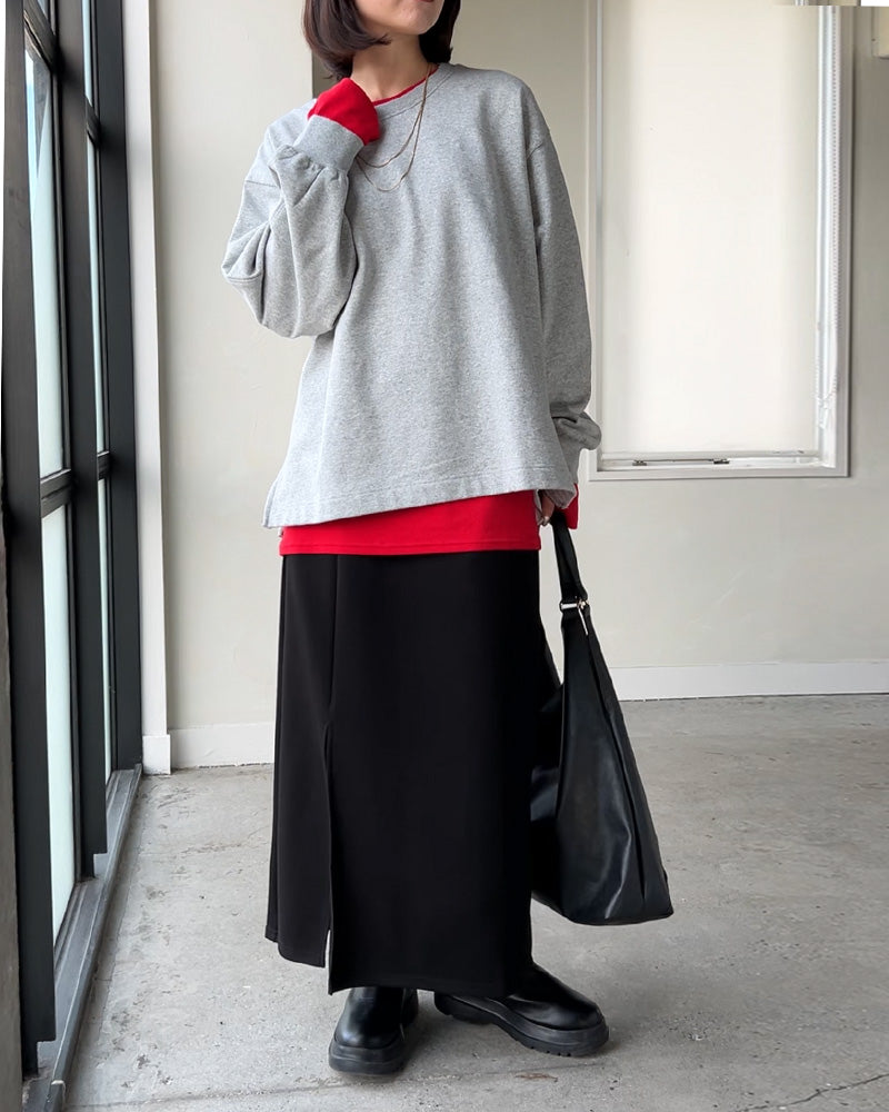 しっとり赤インナーを差して、グレースウェットを大人っぽく。伸びるポンチタイトがほどよく女性らしさを添えて、こなれた雰囲気に。“頑張りすぎないおしゃれ”が叶う、冬の万能配色コーデ。