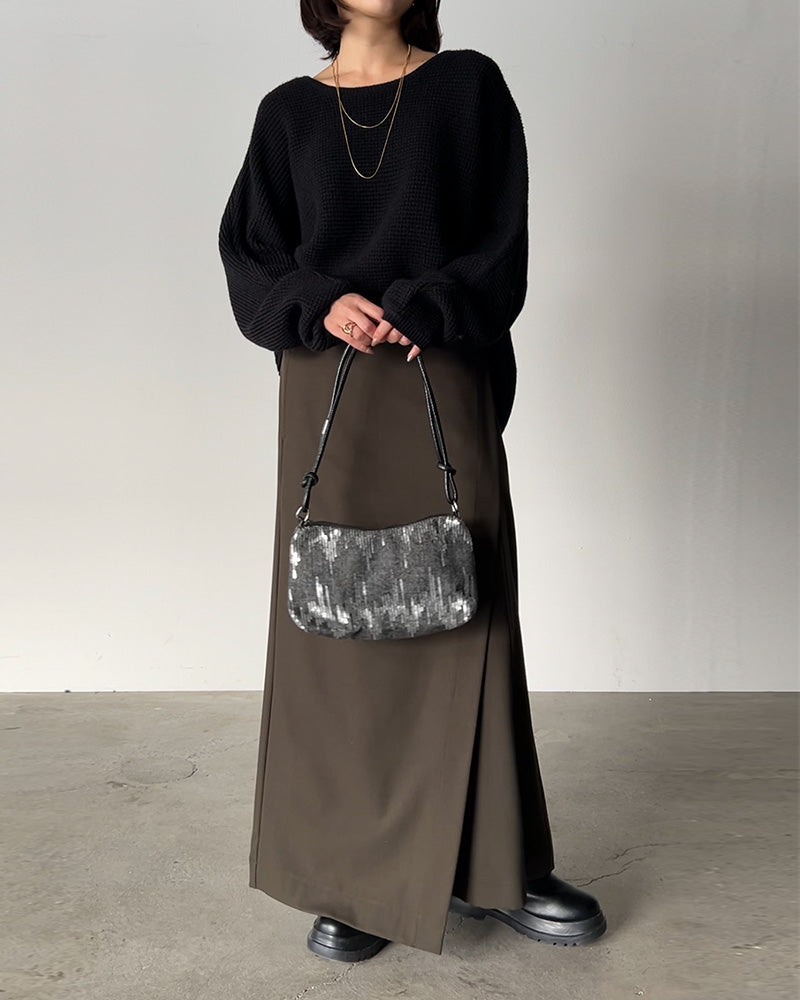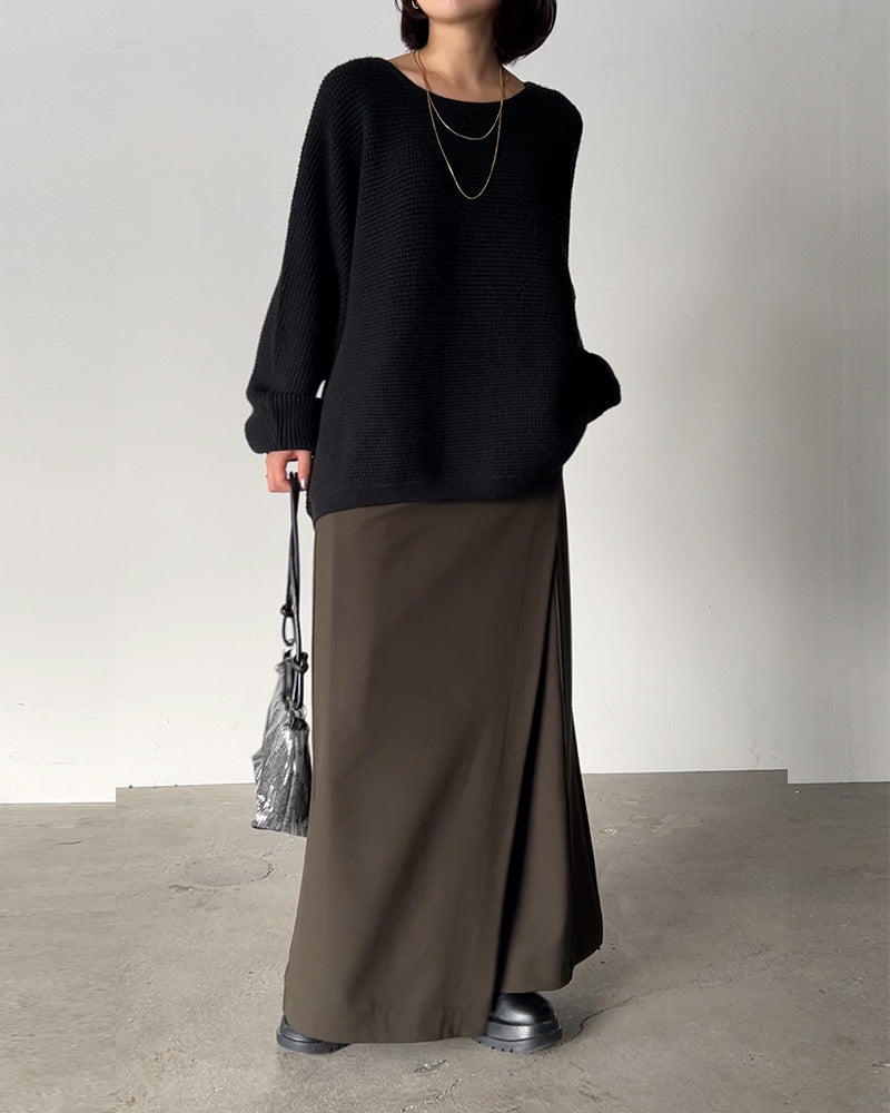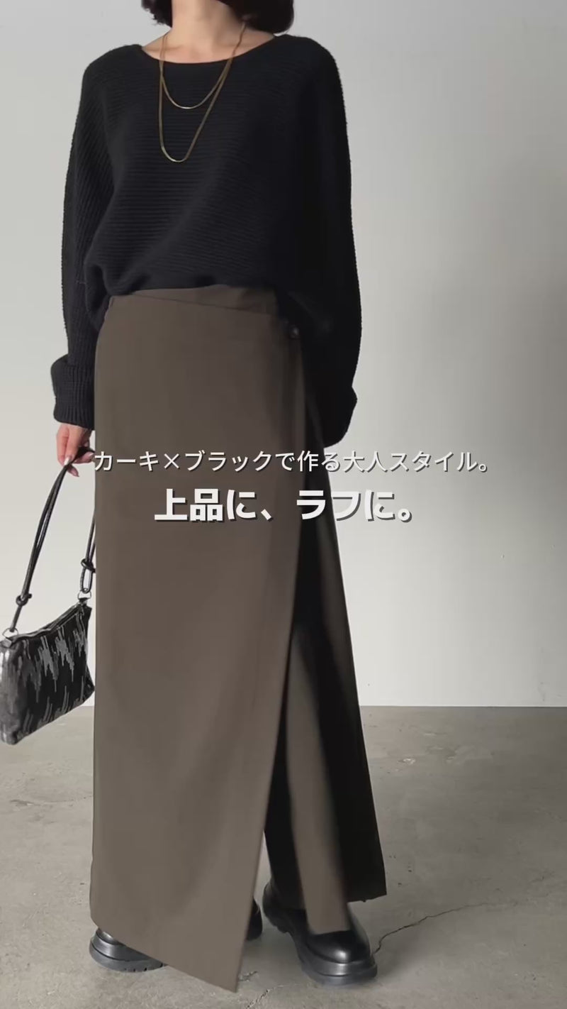 カーキのラップパンツに、黒のワッフルオーバーニットを合わせた上品キレイ目コーデ。ほどよい立体感と抜け感のあるシルエットで、大人らしい落ち着きをキープしつつこなれ見え。オンにもオフにも映える、万能バランスです。