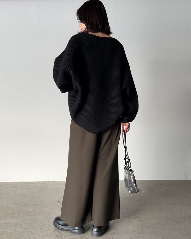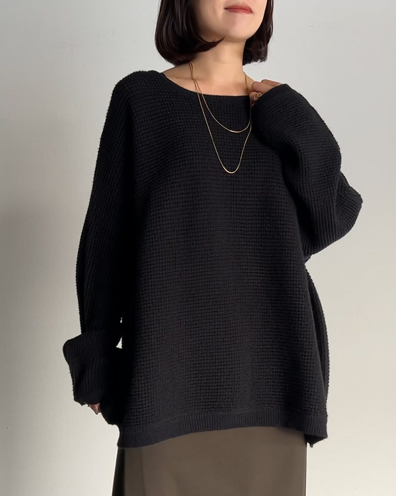 2025AW新作 ニット ワッフル プルオーバー レディース トップス セーター ロング オーバー バルキー 長袖 長い クルーネック ボートネック リブ チュニック ドルマン ゆったり 体型カバー 大きいサイズ レイヤード お尻が隠れる カジュアル 黒 赤 秋 冬 HUG.U