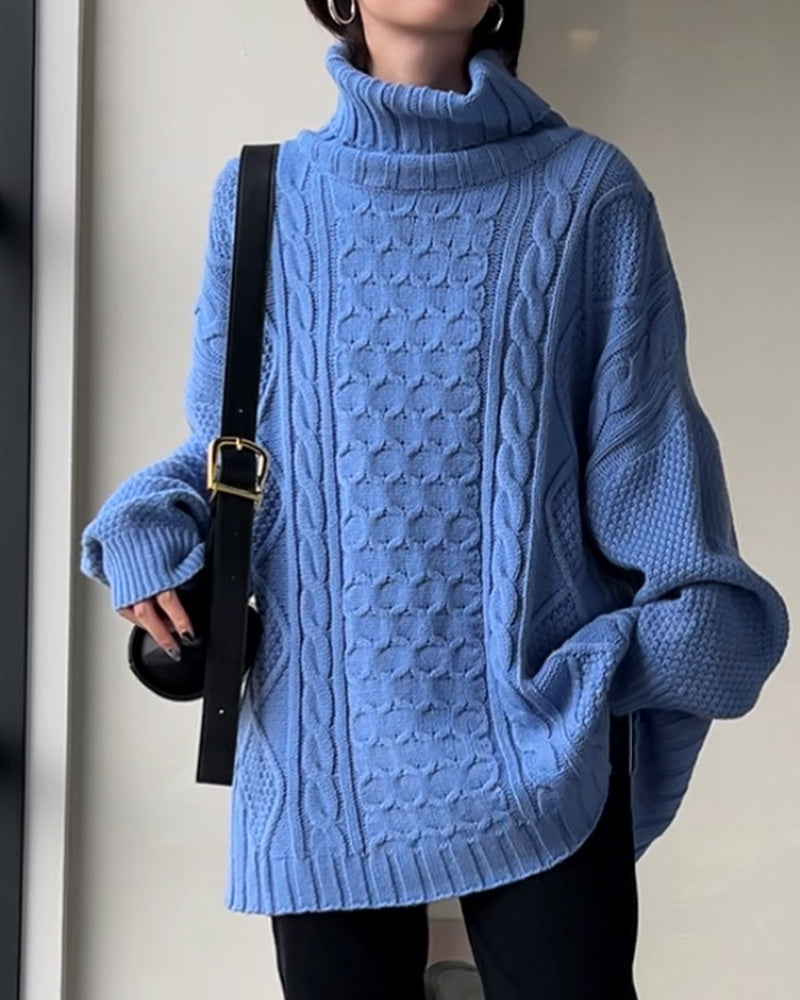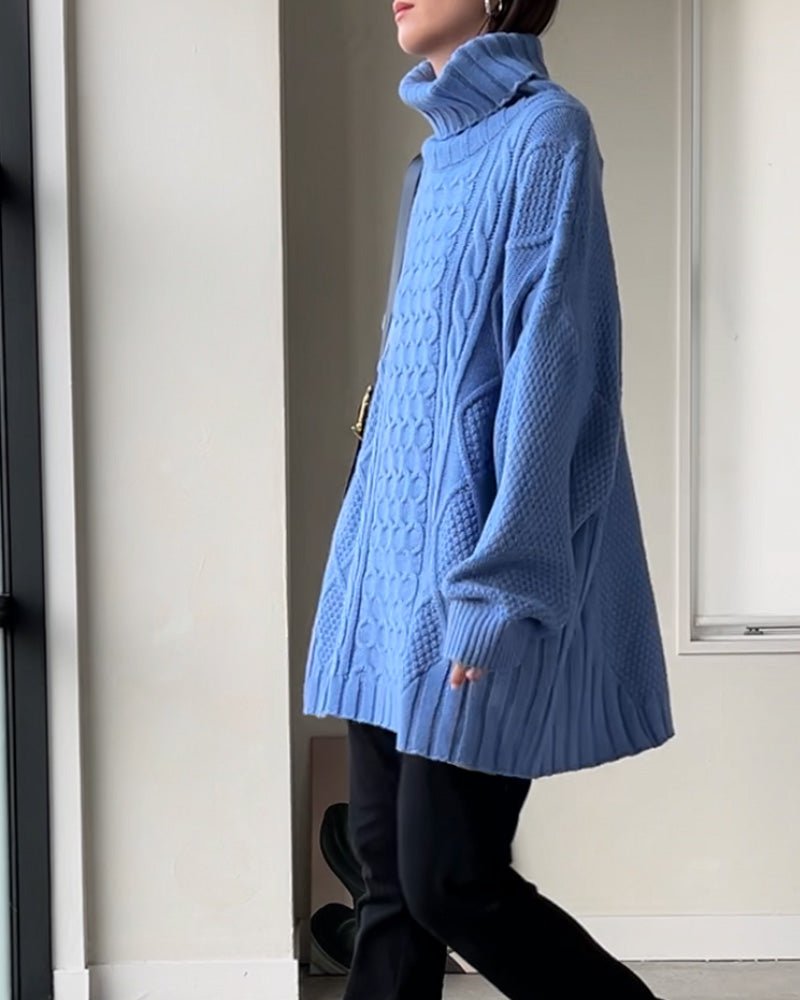 2025AW新作 ニット タートルネック ケーブル ■一部1月下旬入荷 ロング レディース トップス セーター オーバー プルオーバー ケーブル編み ハイネック 長袖 長い ボリュームスリーブ リブ チュニック ゆったり 体型カバー 大きいサイズ お尻が隠れる カジュアル 黒 グレー 秋 冬 HUG.U