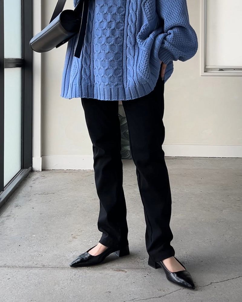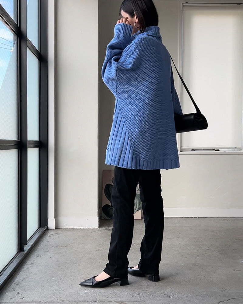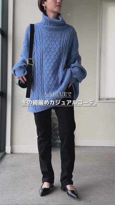 鮮やかなブルーのケーブル編みニットに、黒スキニーを合わせた冬の爽やか美シルエットコーデ。重たく見えがちな季節でも、色の抜け感と細身パンツのバランスでスッキリ見え。暖かさもスタイルアップも欲しい大人の女性にぴったりの組み合わせです。