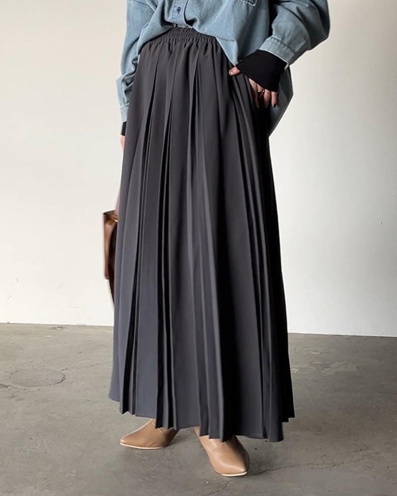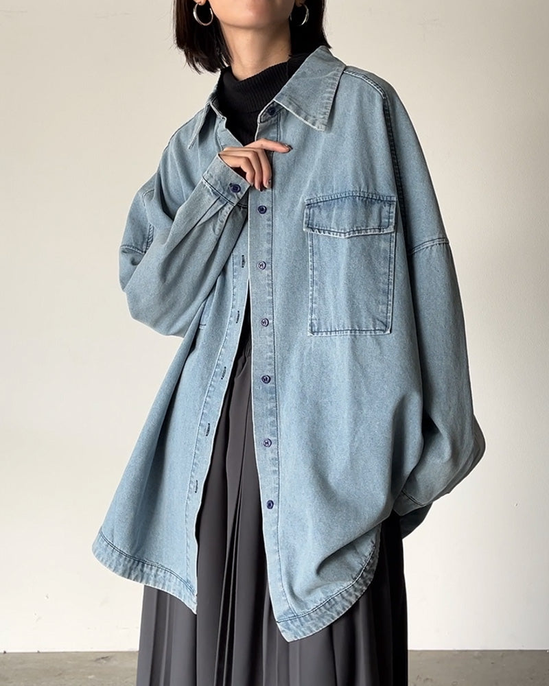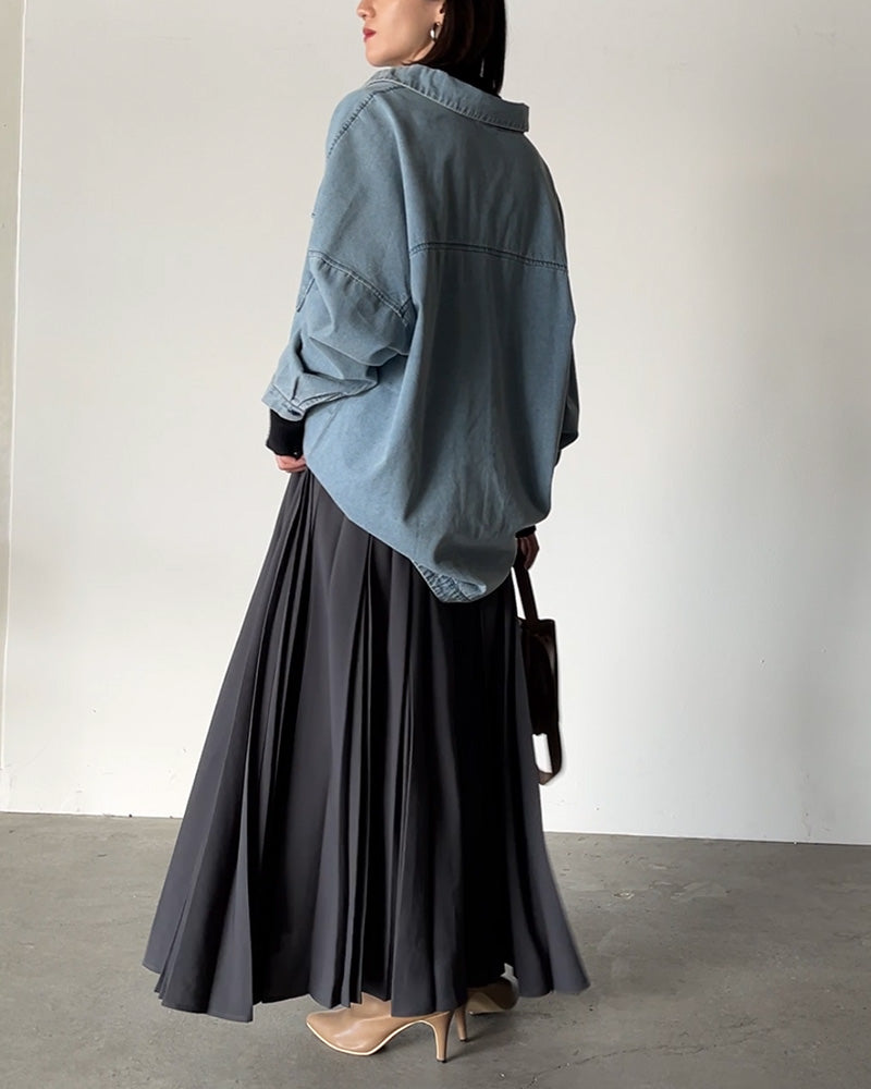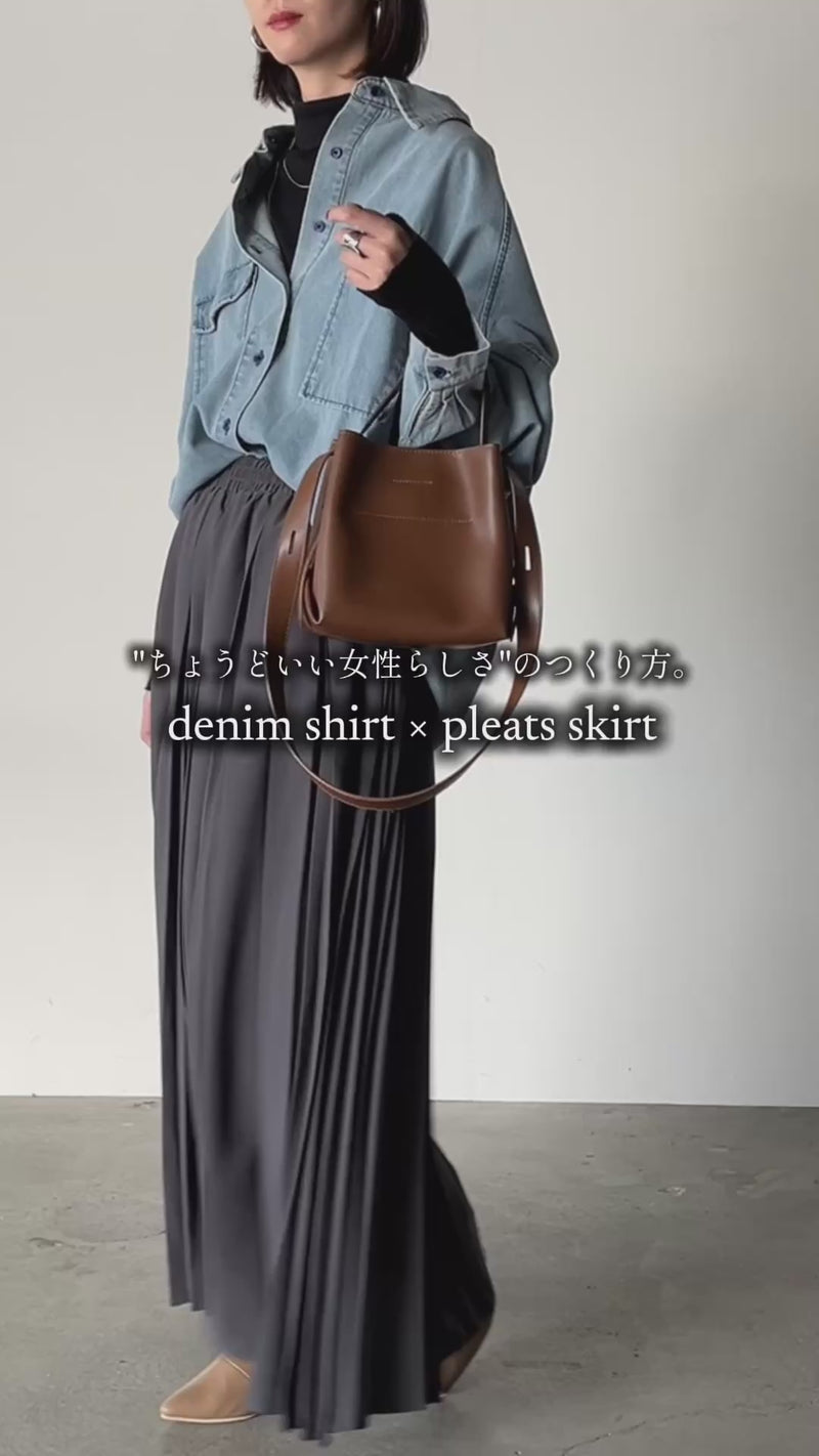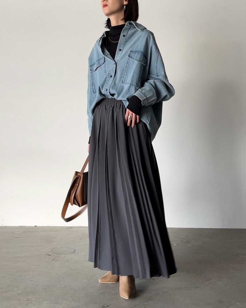 ブルーデニムシャツにニットインナーを重ね、深いグレーのプリーツスカートで仕上げた“奥行きカラー”コーデ。デニムのカジュアル感と、プリーツの揺れが調和して、上品さとこなれ感が同時に叶う一着。色味を抑えたスタイルだからこそ、シルエットの美しさが際立ち、大人の余裕を感じる装いに。