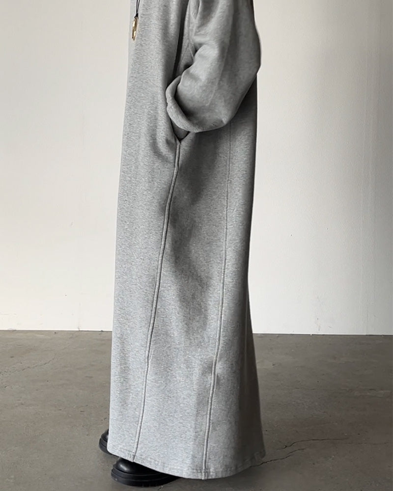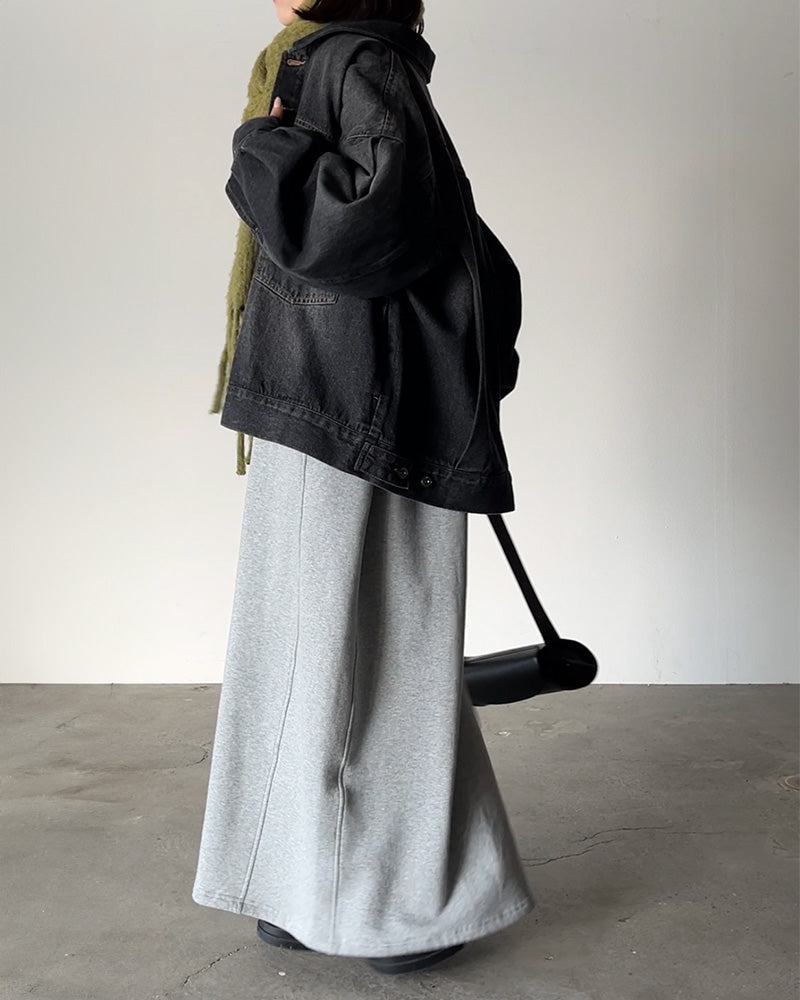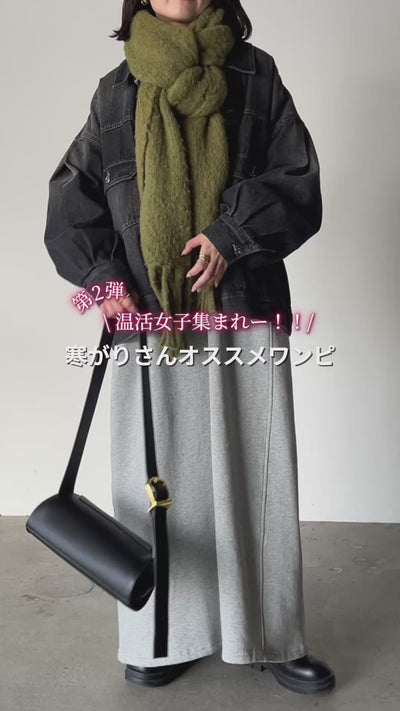 裏起毛のグレーロングワンピに、ぽわん袖の黒Gジャンを重ねて立体感をプラス。差し色のグリーンマフラーが、冬コーデにほどよいアクセントを添えます。足元はジップブーツで引き締め、甘さ控えめの大人バランスに。暖かさも洒落感も妥協しない、冬のお出かけにちょうどいい一着です。