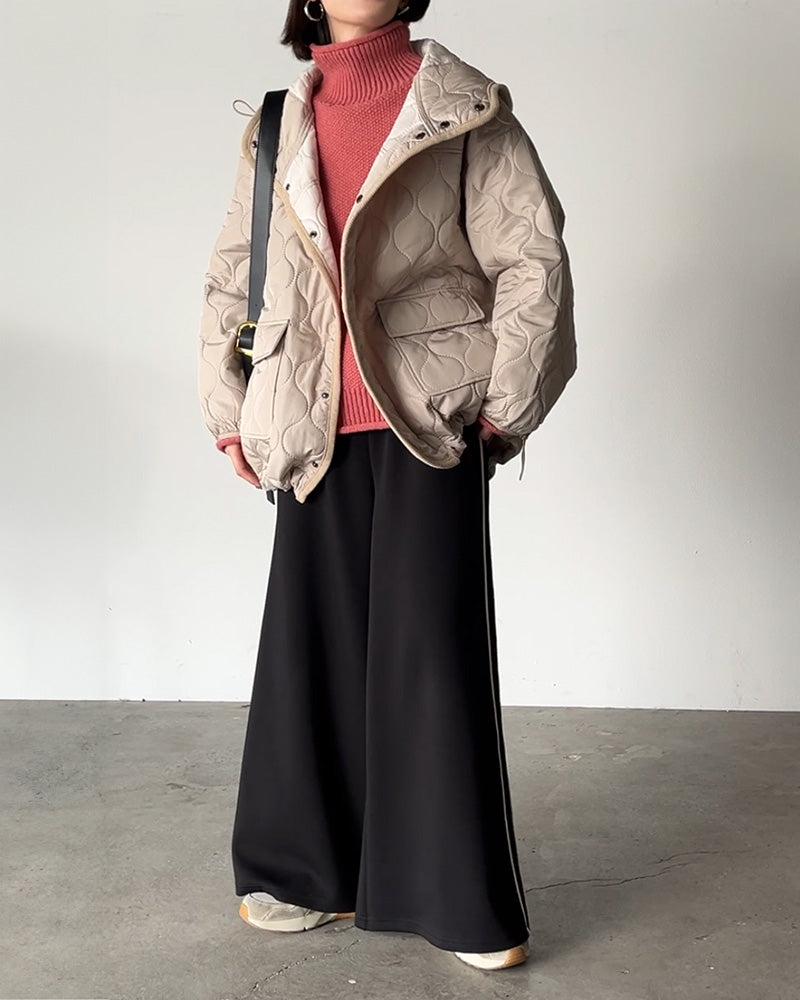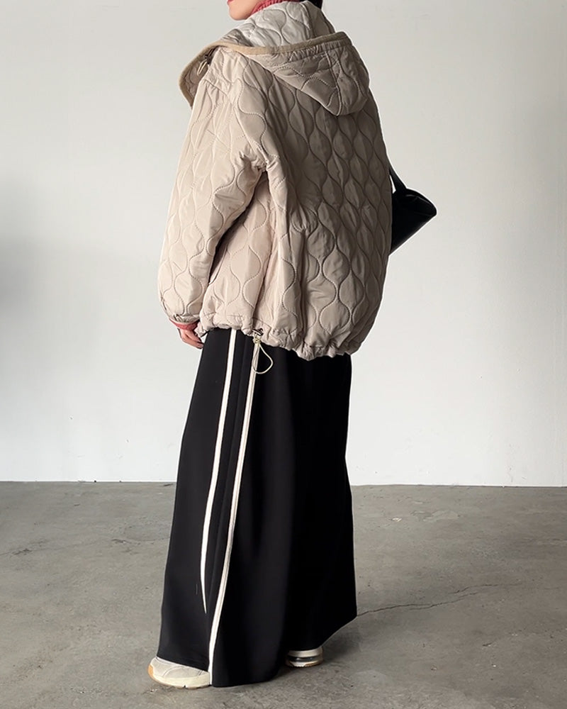 ジャケット キルティング コート レディース アウター ジャンパー キルト フード 無地 刺繍 オーバーサイズ Vネック 中綿 羽織 暖かい ロング ミリタリー お尻が隠れる ライトアウター 大きいサイズ 体型カバー 長袖 ビッグ 長い 黒 カーキ 春 夏 HUG.U