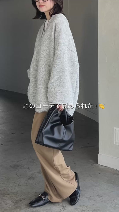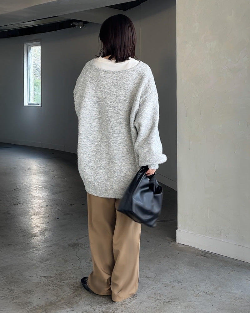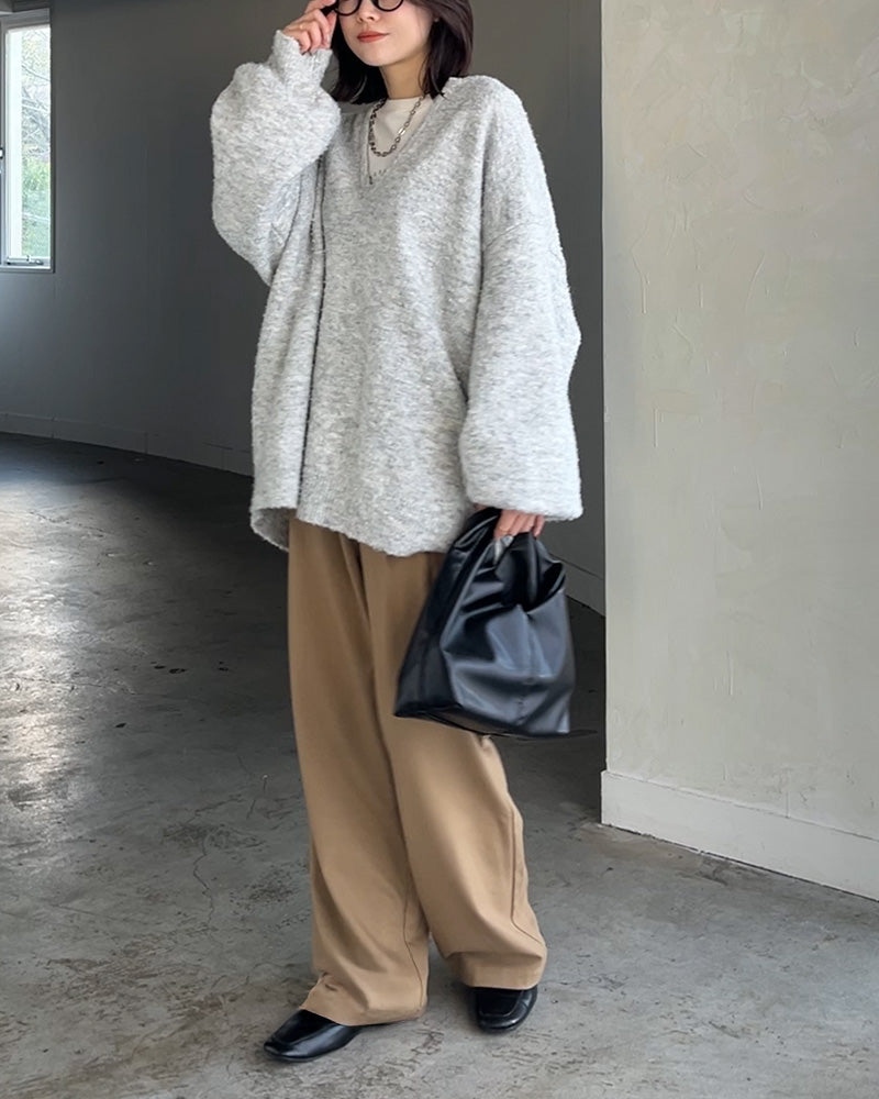 2025AW新作 ニット 深V メランジ レディース トップス ロング セーター オーバー プルオーバー 長袖 長い ボリュームスリーブ Vネック キーネック マーブル リブ チュニック ゆったり 体型カバー 大きいサイズ お尻が隠れる カジュアル 黒 グレー 秋 冬 HUG.U