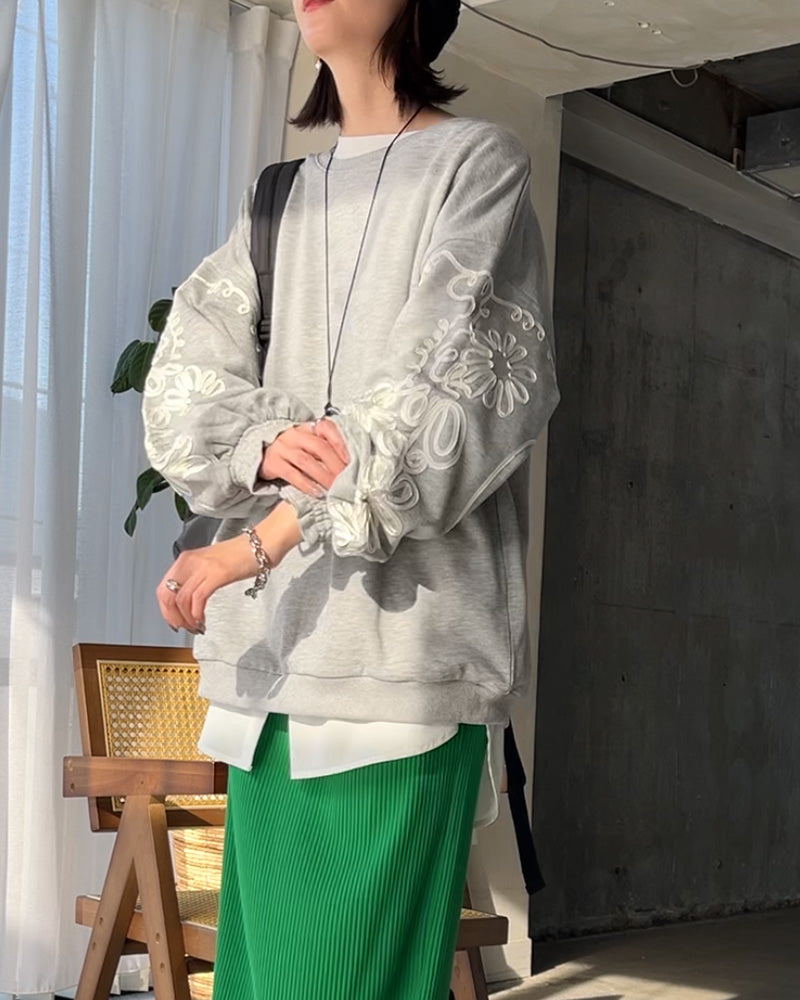 スウェット コード刺繍 レディース トップス チュニック ロング トレーナー オーバー プルオーバー 長袖 長い ドルマン クルーネック ボリュームスリーブ リブ オーバーサイズ ゆったり 体型カバー 大きいサイズ お尻が隠れる 黒 ブルー 秋 冬 HUG.U