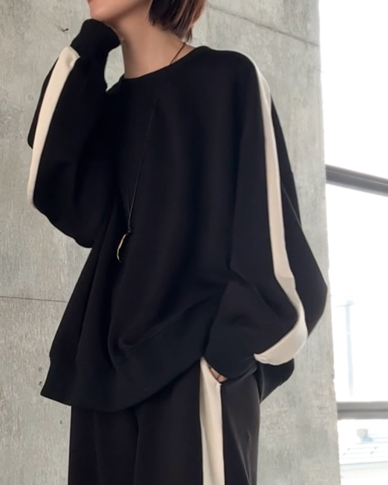 2点セット『 プルオーバー × パンツ 』 ■一部3月中旬入荷 ポンチ生地 レディース セットアップ トップス ボトムス チュニック ロング オーバー ライン 長袖 長い ワイド ワイドパンツ ストレッチ 体型カバー スポーティー 大きいサイズ 黒 ベージュ 春 夏 HUG.U