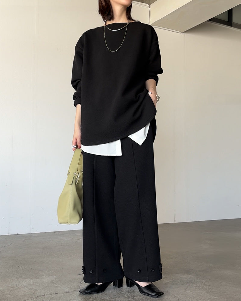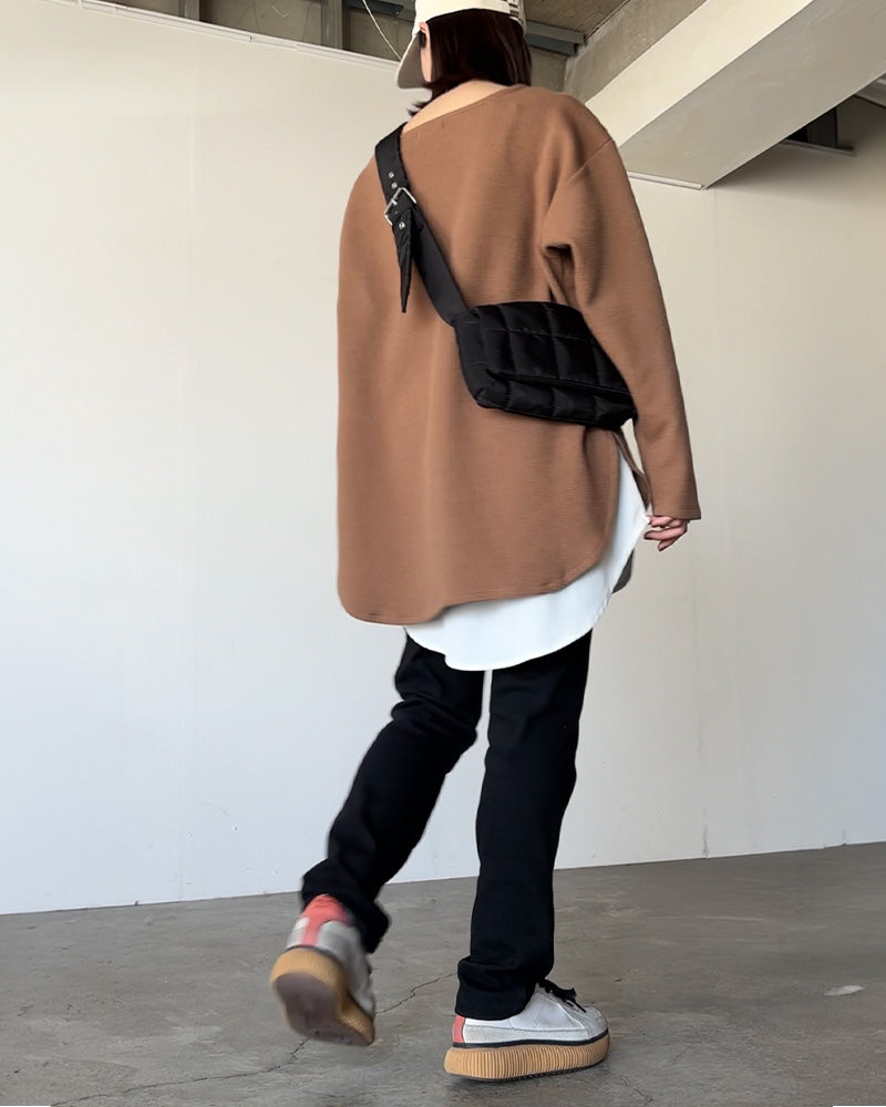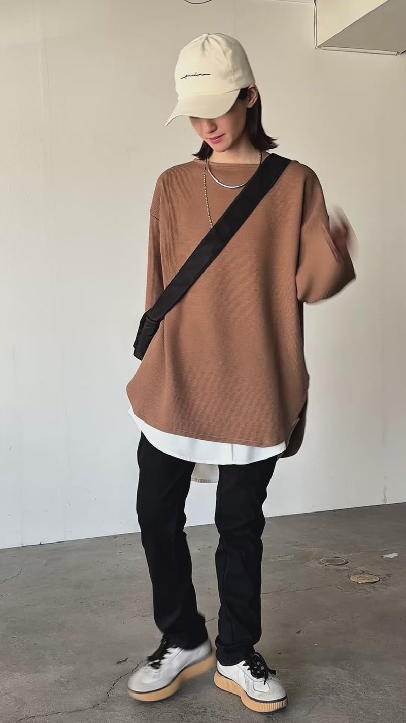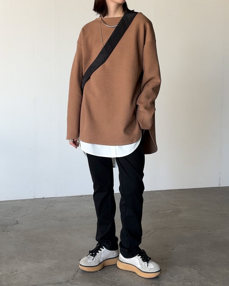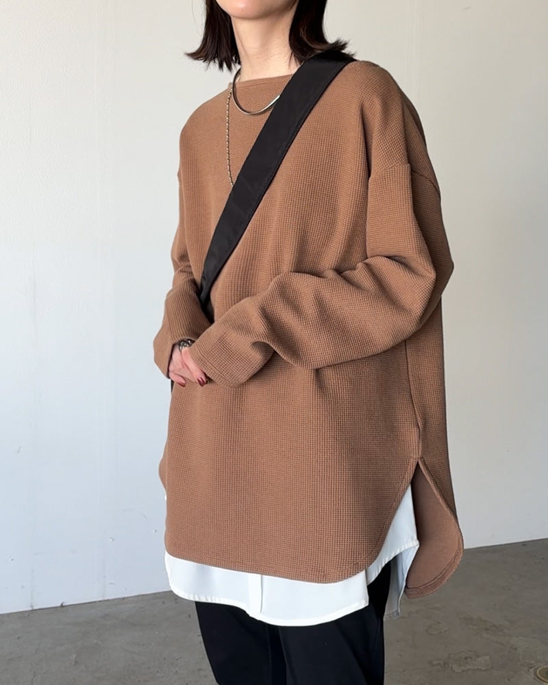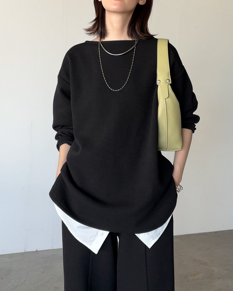 上質ワッフル素材のプルオーバー🌿表情のある生地感で、カジュアルにもきれいめにも振れる一枚。ボートネックが首元をすっきり見せてくれます🪞同素材のセットアップ展開もあり📌揃えて着ると、おしゃれ上級者に🎨