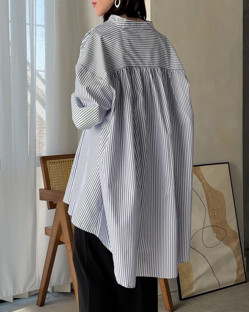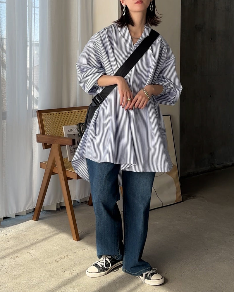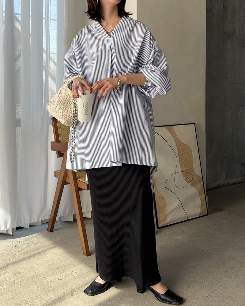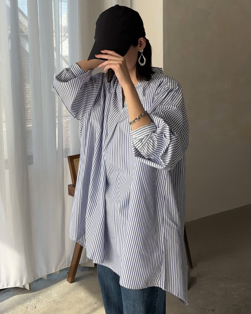シャツ 映え ギャザー 体型カバー トップス レディース ■一部4月中旬入荷 ストライプ チュニック スキッパー キーネック 長袖 大きいサイズ ドルマン ロングシャツ ロング ブラウス オーバーサイズ ゆったり お尻が隠れる ブルー 白 重ね着 春 夏 HUG.U メール便