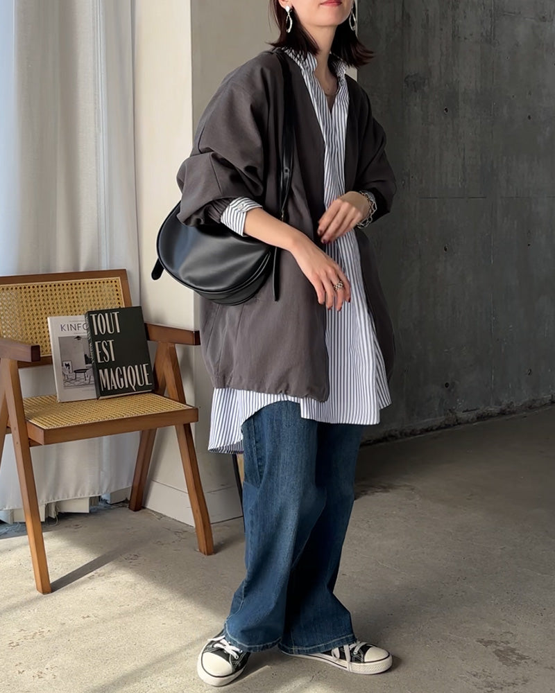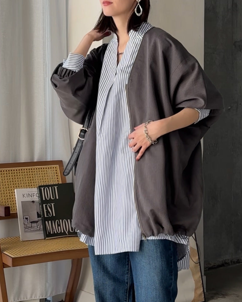 ジャケット ロング ドルマン レディース アウター ■一部4月下旬入荷 トップス オーバー お尻が隠れる ジャンパー コート 無地 長袖 Vネック ライトアウター コクーン ノーカラー 羽織 チュニック 大きいサイズ 体型カバー 着物コート 着物 黒 グレー 夏 春 HUG.U