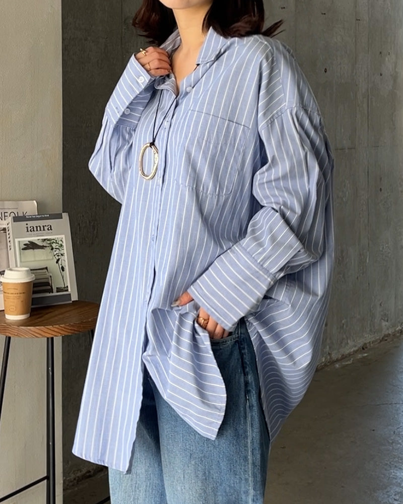シワになりにくい 『 理想的 』 体型カバー ■一部4月下旬入荷 トップス レディース ストライプ シャツ チュニック 長袖 カラーシャツ 大きいサイズ ドルマン ロングシャツ ロング ブラウス 羽織 オーバーサイズ ビッグ ブルー 重ね着 春 夏 HUG.U メール便
