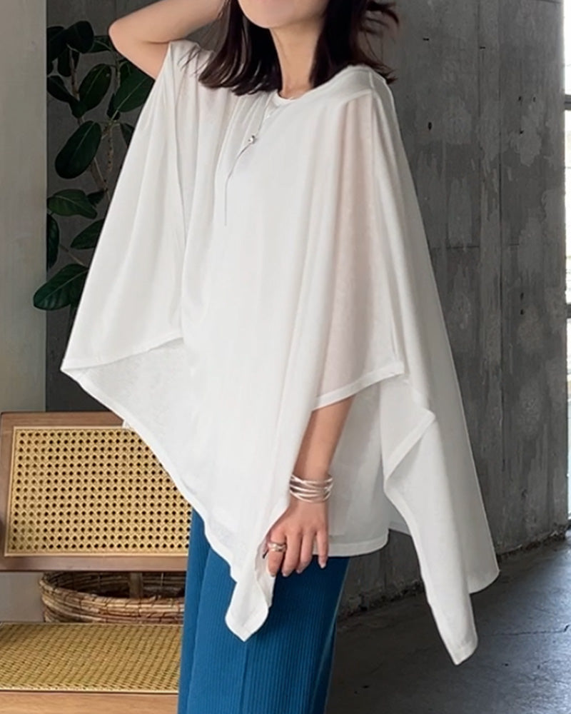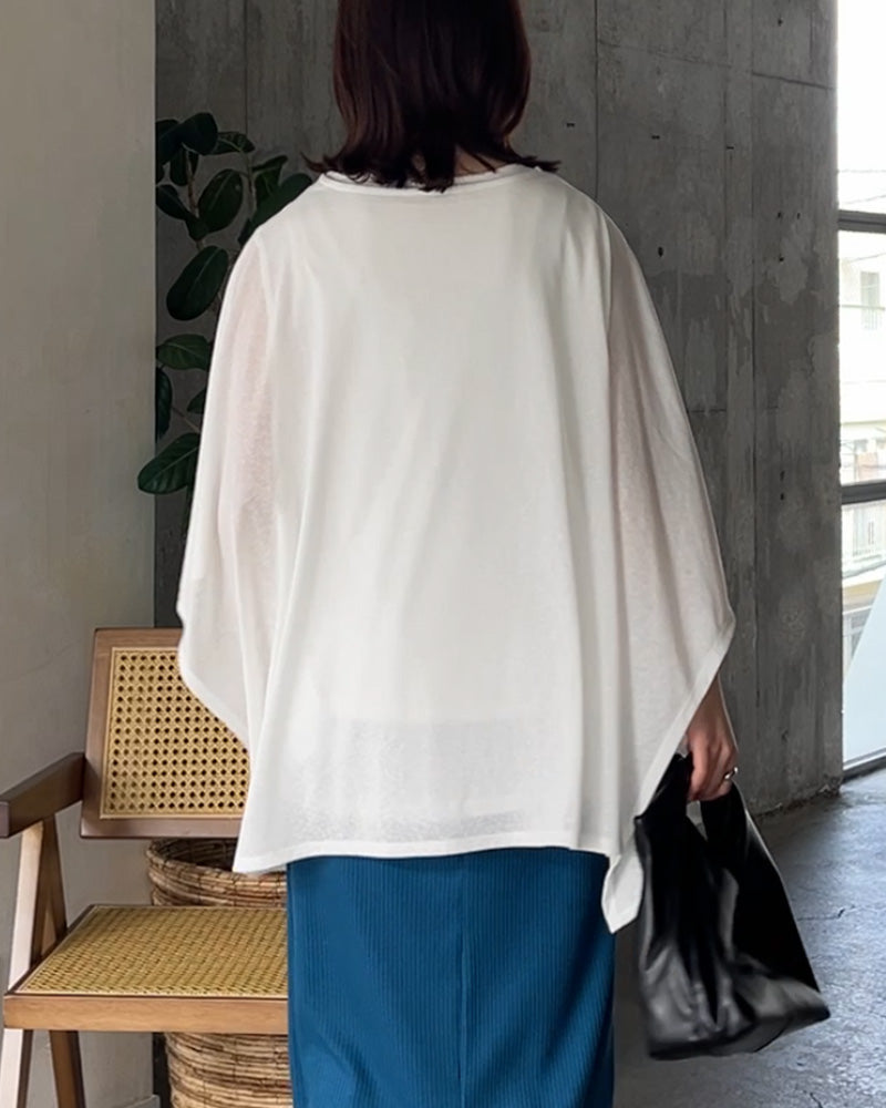 2026SS新作 Tシャツ ドルマン レディース ■一部5月下旬入荷 トップス カットソー 半袖 五分袖 七分袖 クルーネック ケープスリーブ 二の腕カバー 体型カバー お尻が隠れる 涼しい 大きいサイズ 伸縮性 ストレッチ きれいめ カジュアル スラブ天竺 無地 春 夏 ホワイト ブラック HUG.U