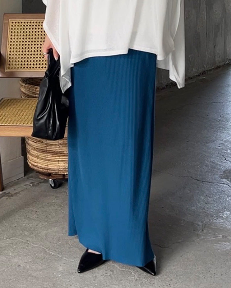 スカート タイトスカート ロングスカート セルフカット レディース ボトムス ペンシルスカート リブ生地 シワになりにくい 無地 伸縮性 ウエストゴム ストレッチ スリット Iライン ロング マキシ マキシワンピース 体型カバー ブルー 黒 春 夏 HUG.U