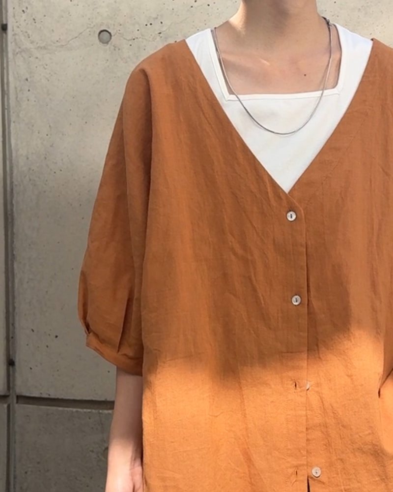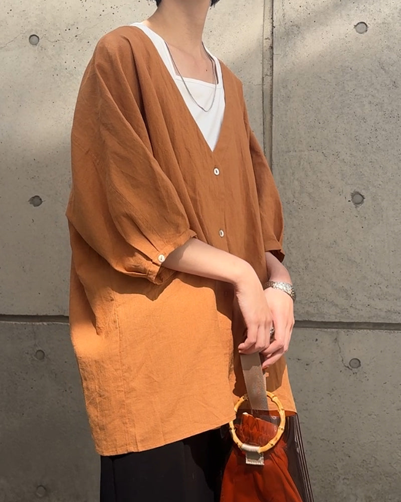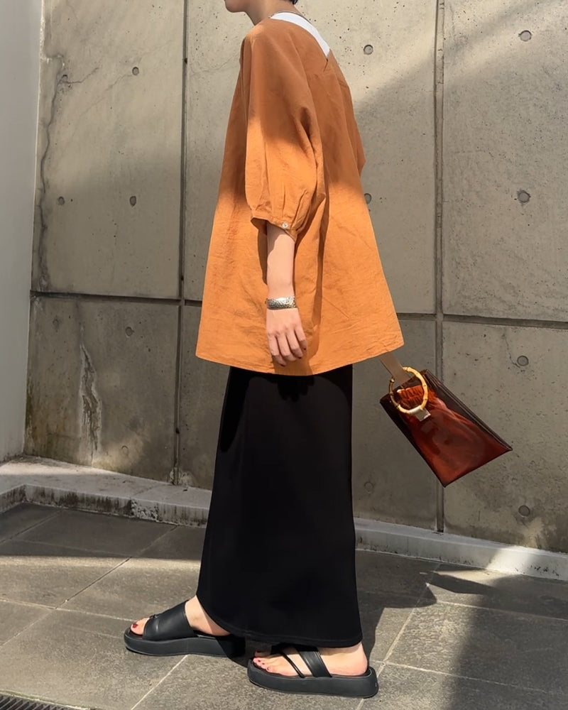 テラコッタカラーの麻ブラウスを羽織り、白タンクトップで抜け感をプラス。ストレッチの効いた黒タイトスカートで美シルエットを叶えつつ、動きやすさも兼ね備えたスタイルです。大人の余裕を感じさせる色合わせと素材感で、お出かけにもオフィスカジュアルにも活躍する一枚。