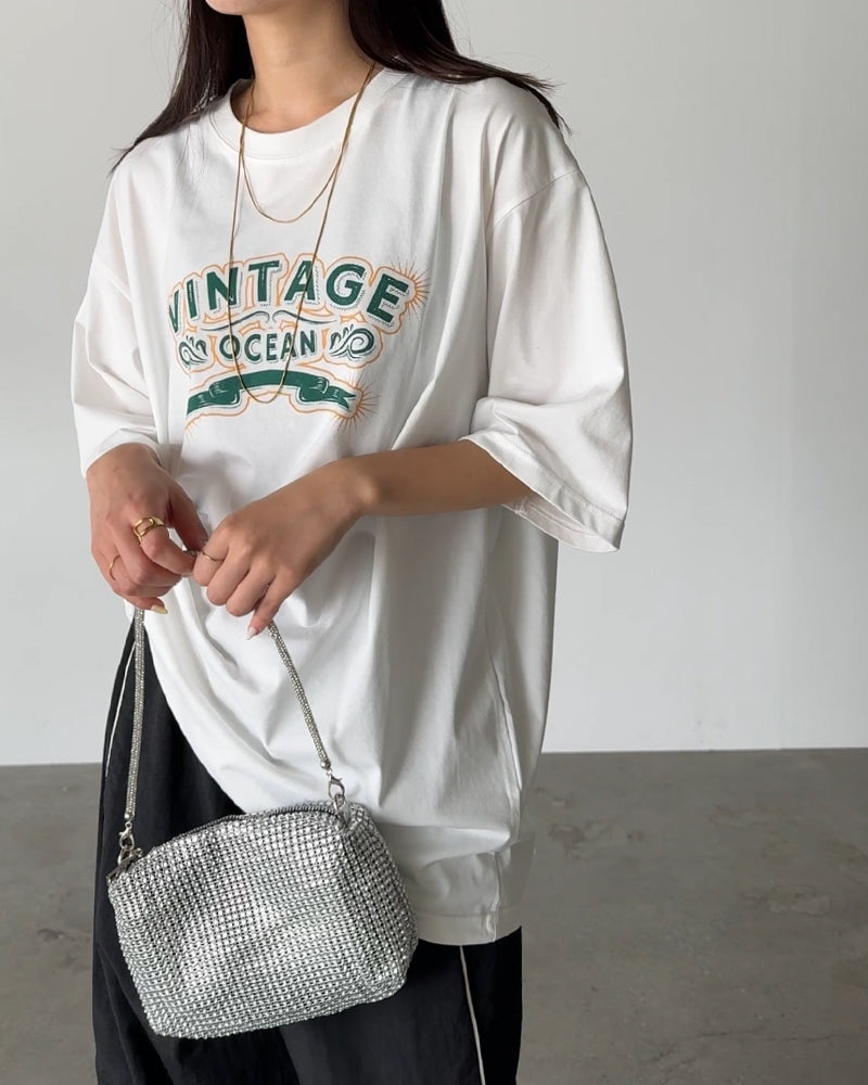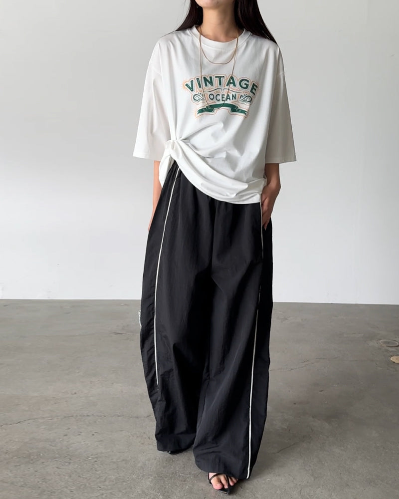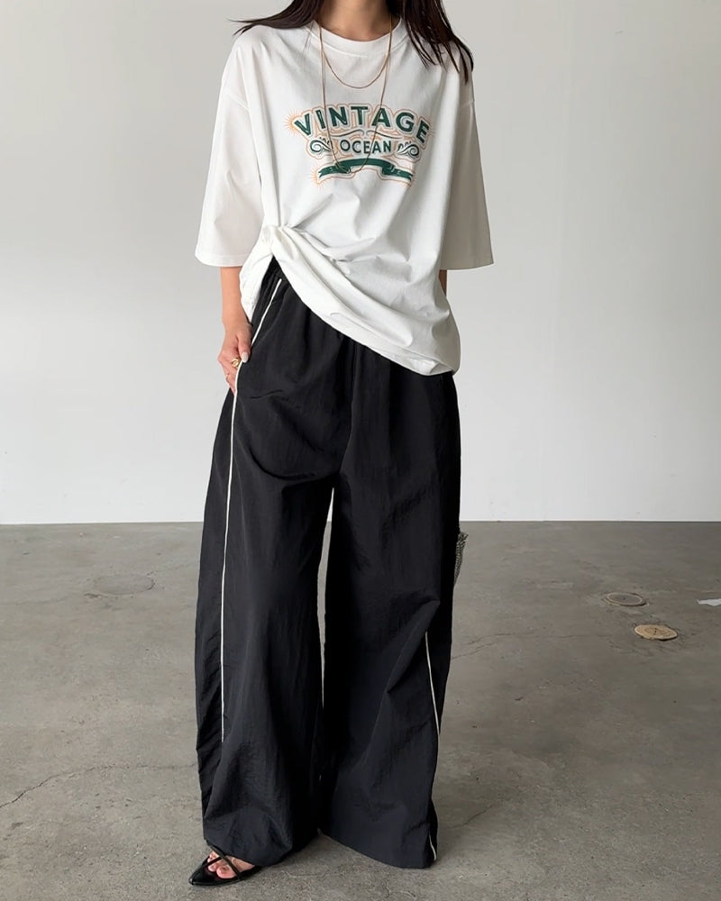 白のロゴTシャツに、黒のナイロンワイドパンツを合わせたモノトーンコーデ。シンプルながらもスポーティな抜け感があり、大人のデイリーカジュアルにぴったり。動きやすさとスタイリッシュさを兼ね備えた着こなしで、街歩きにもアウトドアにも映える万能スタイルです。