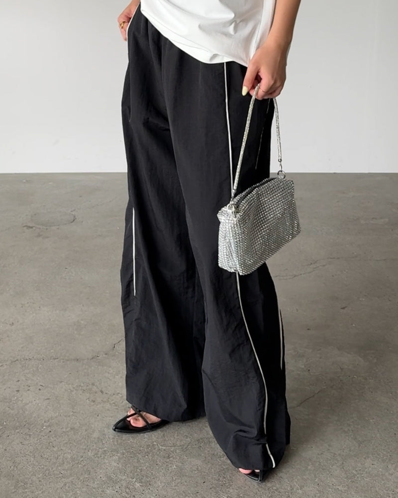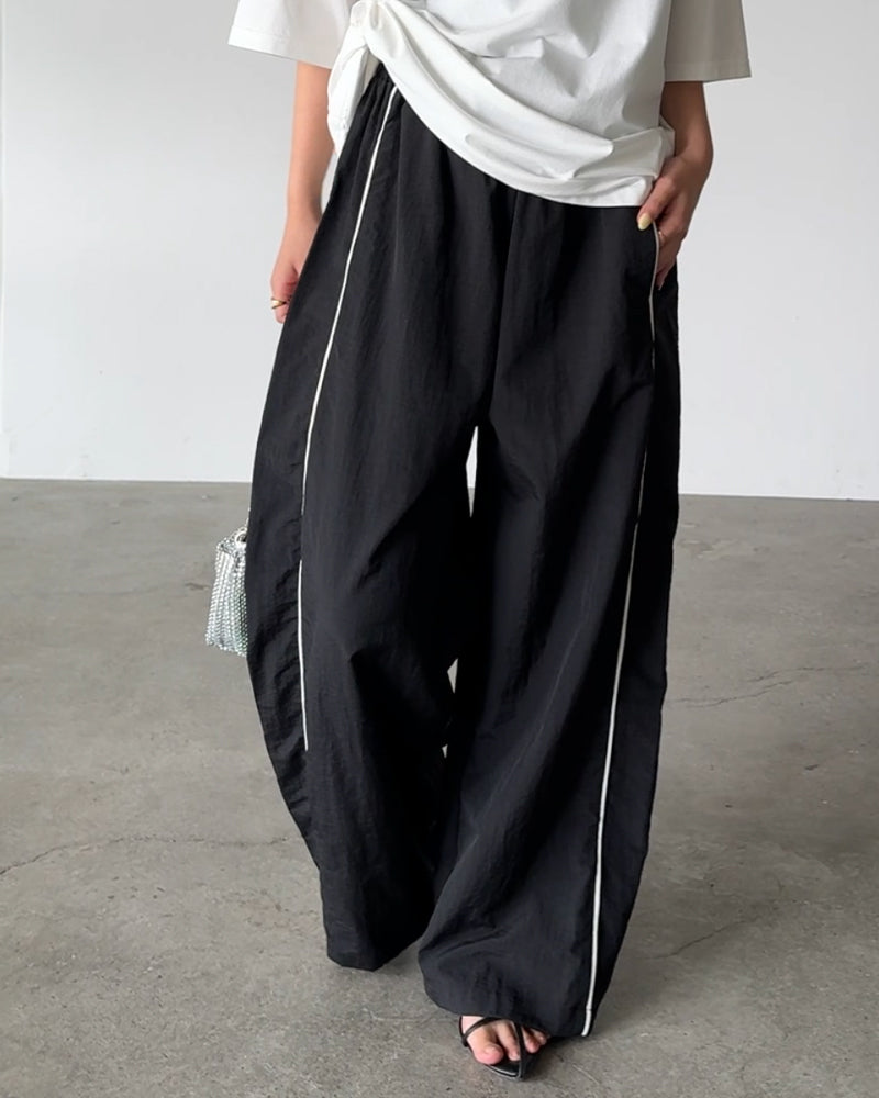 パンツ ワイド ナイロンパンツ レディース ワイドパンツ ロング ロングパンツ 体型カバー 長い 薄手 軽量 ボトムス ボトム ストレート ズボン ゆったり ハイウエスト ナイロン サイドライン スポーティー 大きいサイズ 黒 ベージュ 春 夏 HUG.U