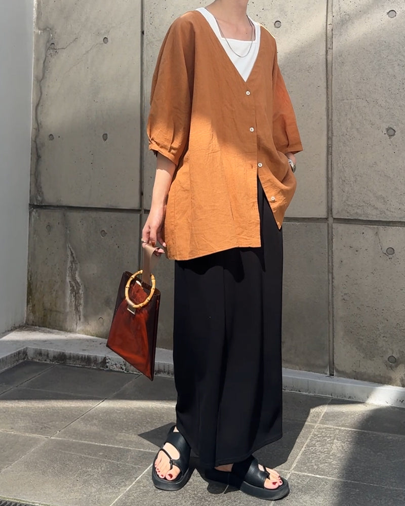 【鮮やかオレンジを効かせた、大人のレイヤードコーデ】