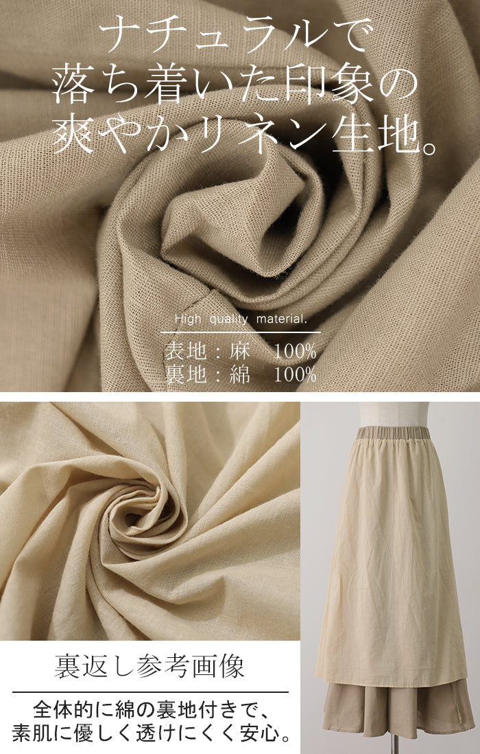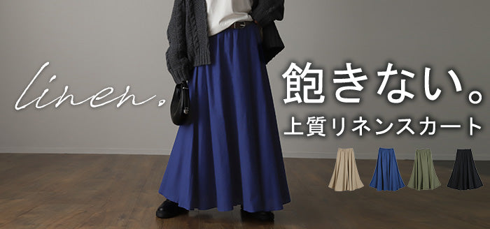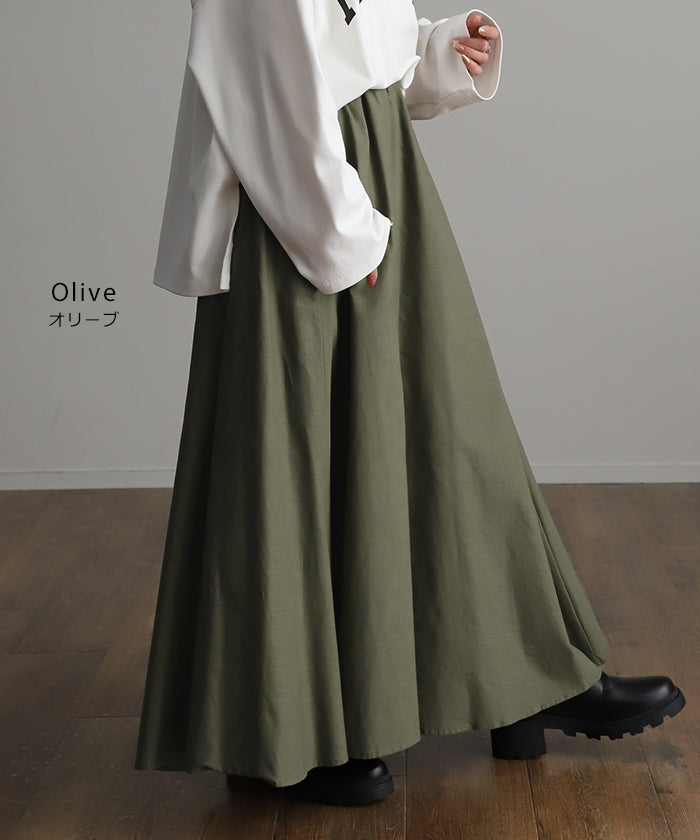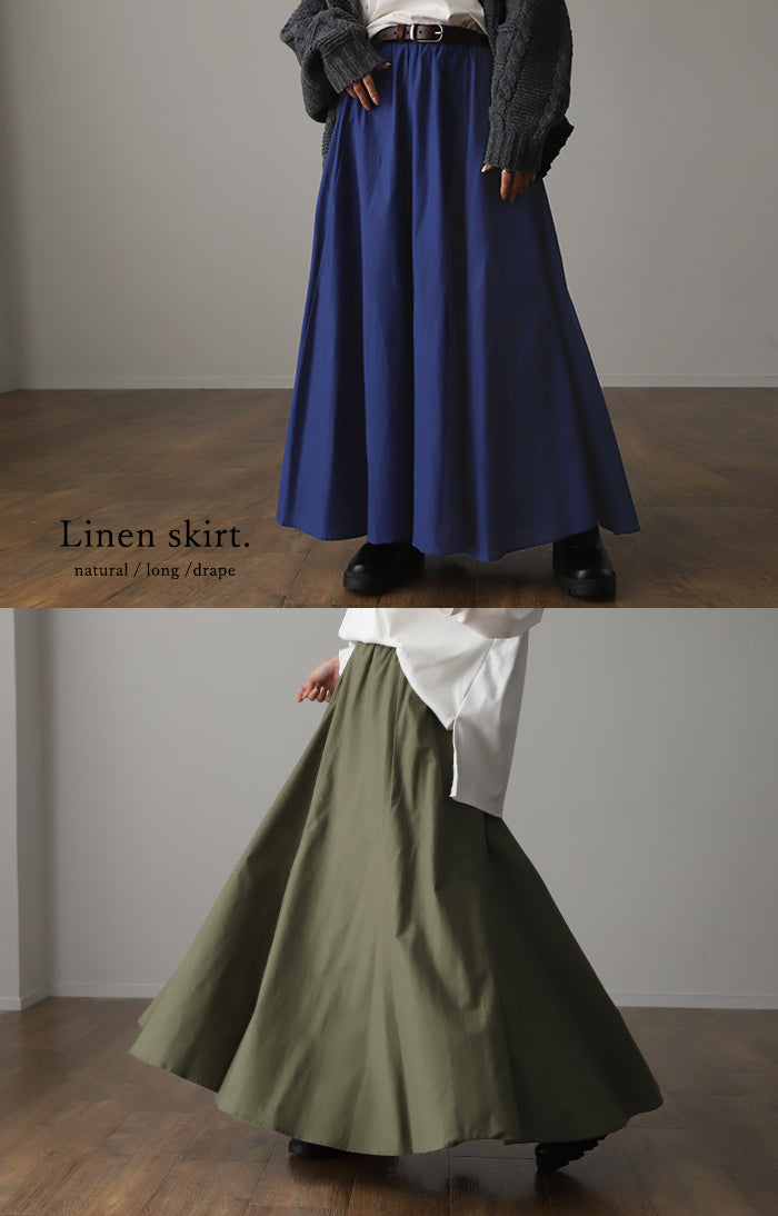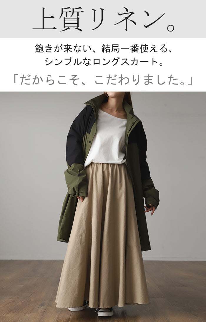 リネンのさらりとした風合いとナチュラルな表情を活かしたシンプルなスカートです。大胆に広がるシルエットがカジュアルな中にも上品な女性らしさを感じさせる1枚。ふわっと広がるフレアが涼しく快適で1枚でコーデが決まる主役級スカート。