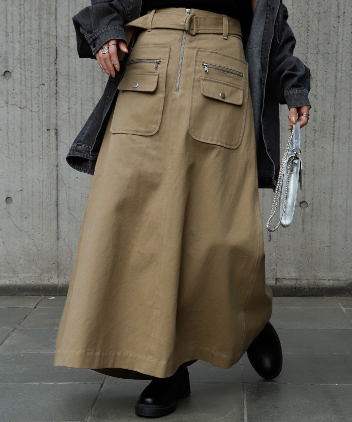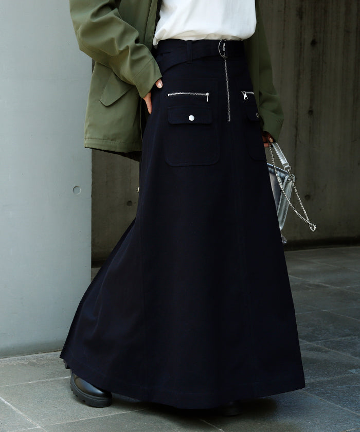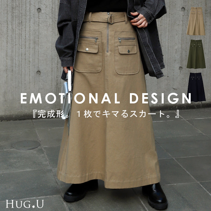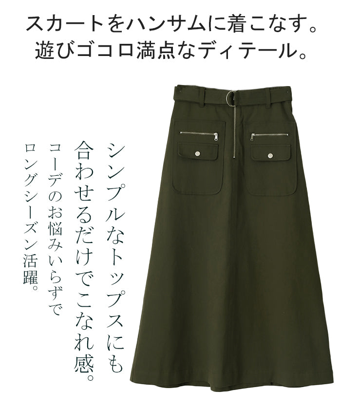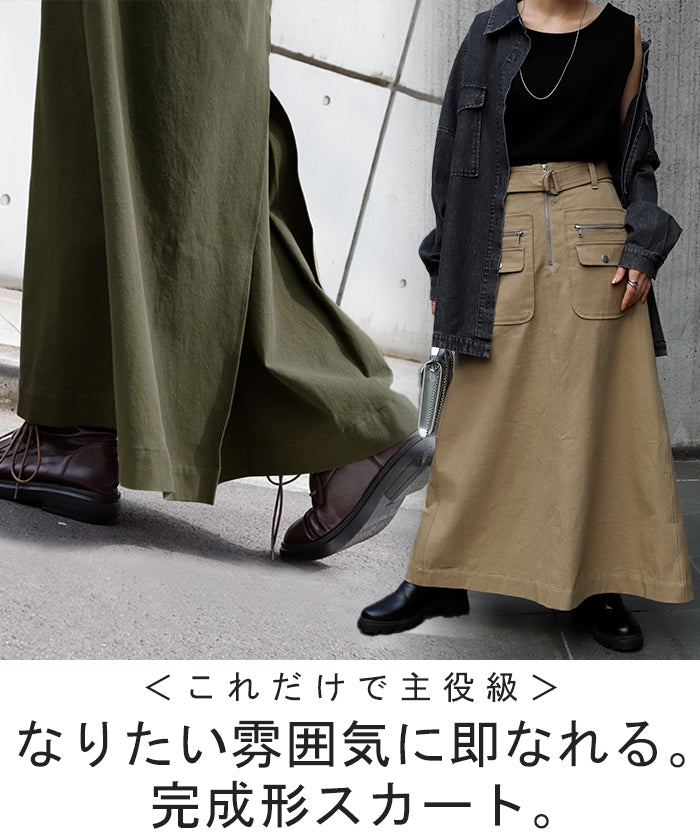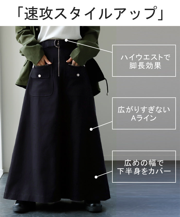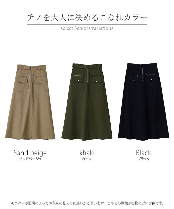 「 普通は嫌。」 チノ スカート Aライン ポケット チノスカート Aラインスカート レディース ベルト ボトムス ロングスカート ロング マキシ ゴム ウエストゴム ジップ 大きいサイズ 無地 黒 ブラック 春 夏 ビジュアル系 HUG.U