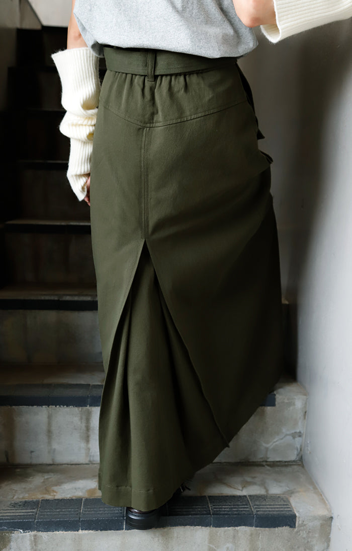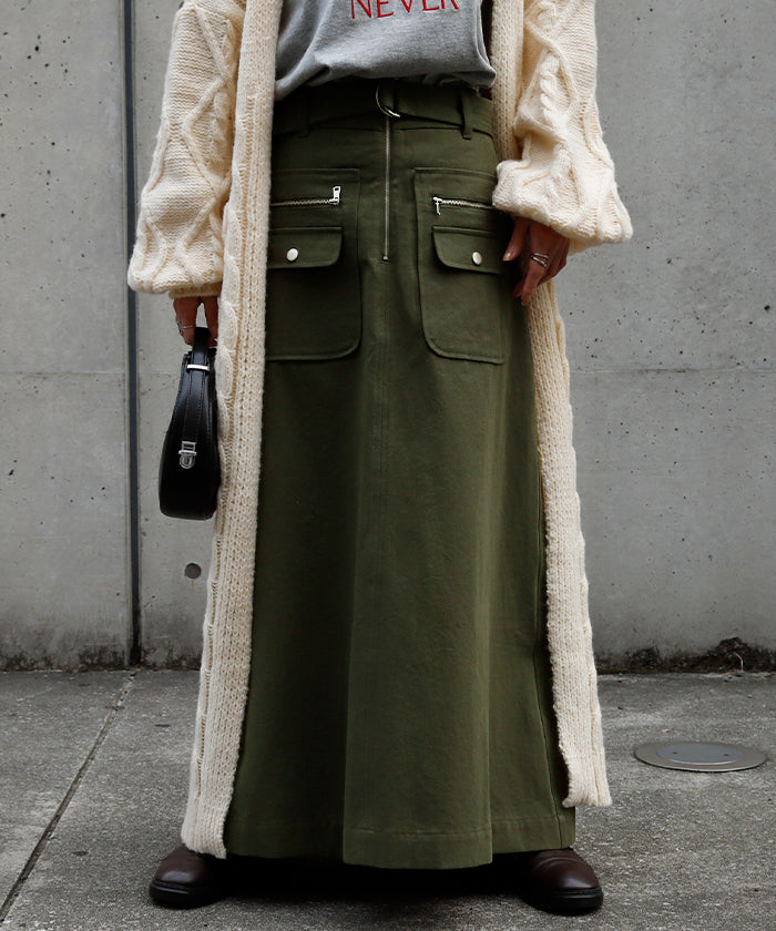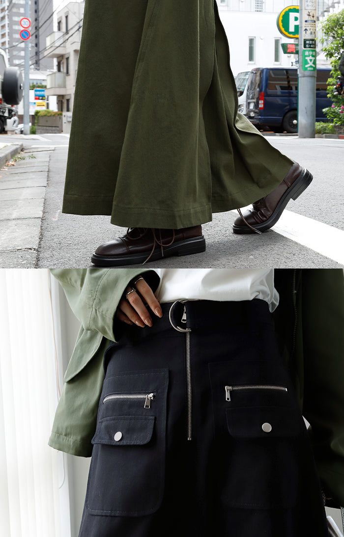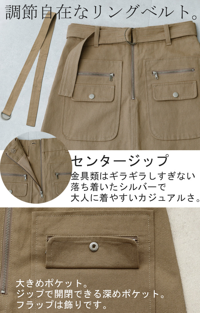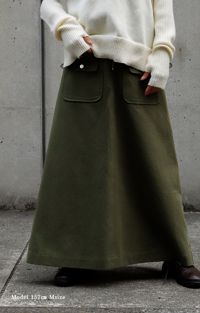 柔らかい素材感で軽やかに着れる大人にもおすすめのミリタリースカートです。ポケットがアクセントになりシンプルな着こなしのポイントにもなります。カジュアルなロンTやニットから女性らしいブラウスまで幅広く合わせていただけます。