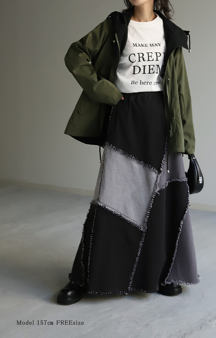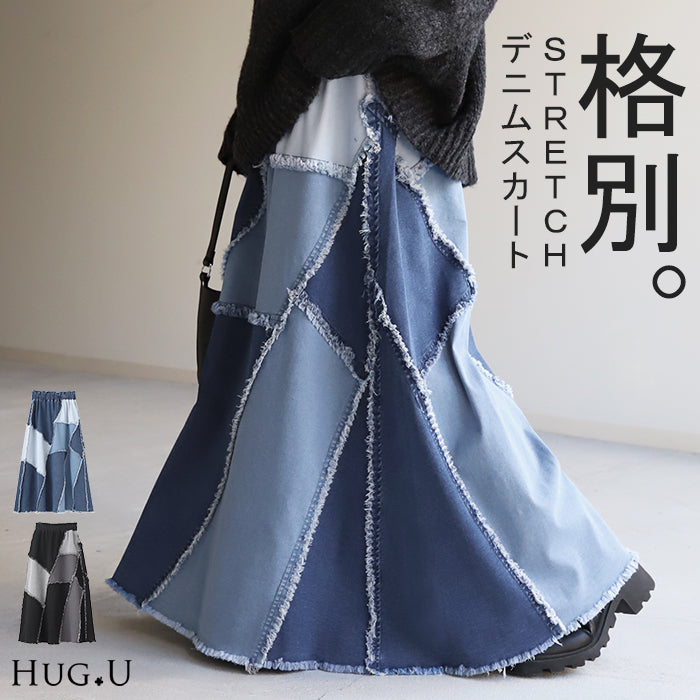 デニム 『 3色 フリンジ 切り替え 』 スカート デニムスカート ロングスカート ロング フレア Aライン Aラインスカート ボトムス パッチワーク おしゃれ マキシ マキシスカート フリンジスカート ゴム ゆる 体型カバー 伸縮性 大きいサイズ 春 夏 HUG.U