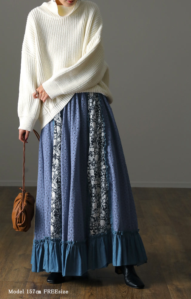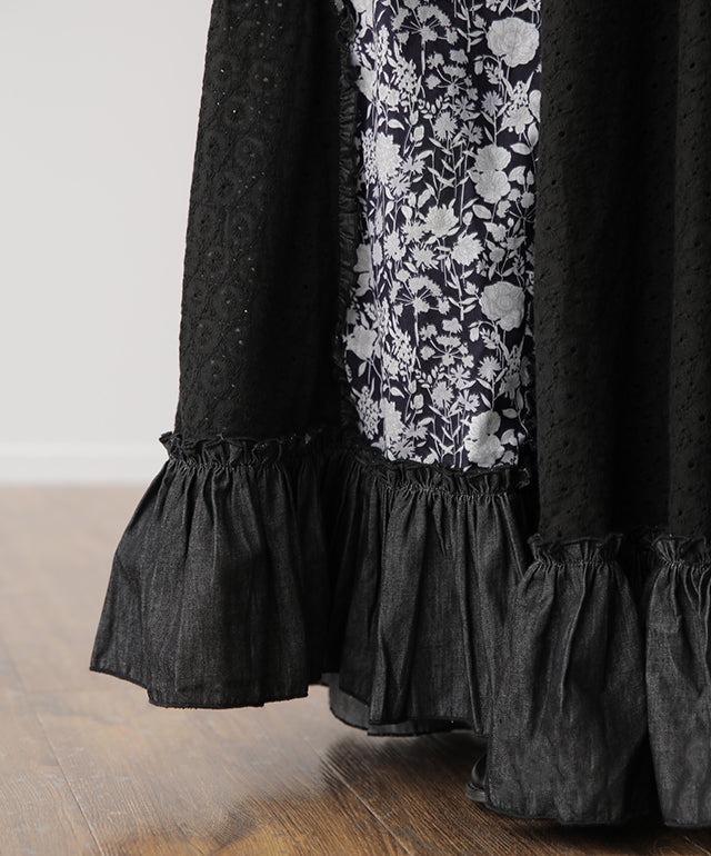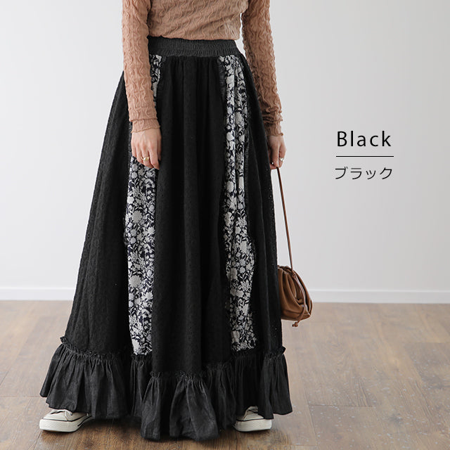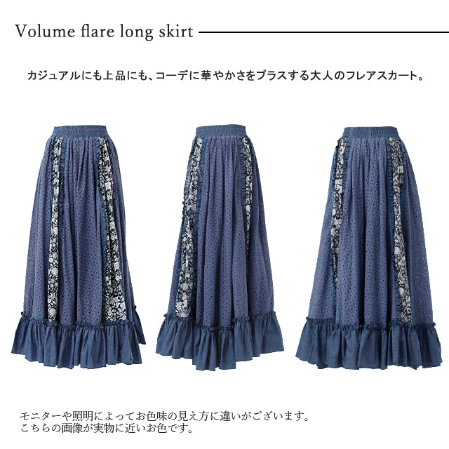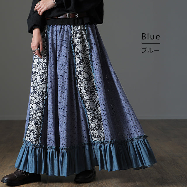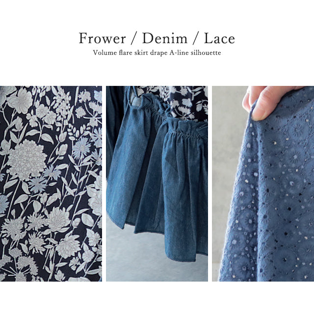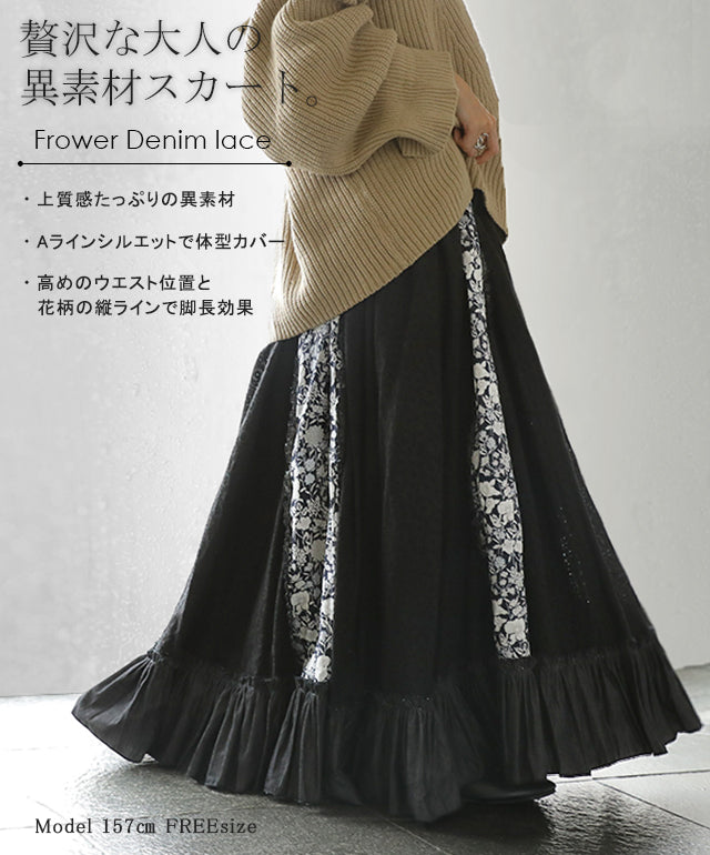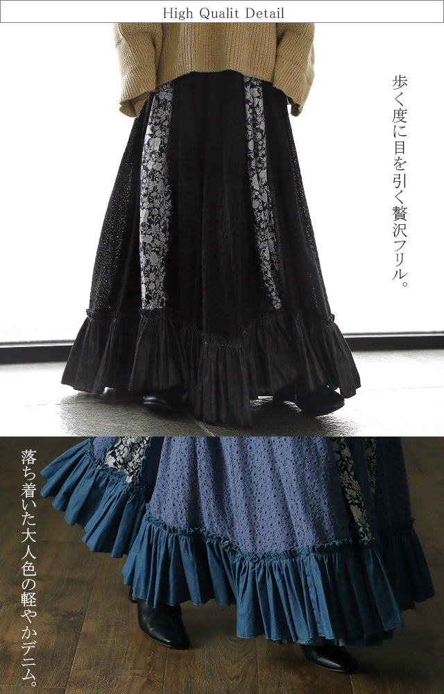 スカート ロングスカート ロング マキシスカートマキシ 花柄 フリルスカート 体型カバー デニムスカート レーススカート レース フレア フレアスカート ウエストゴム レディース デニム デニムスカート レトロ 大きいサイズ 春 夏 x237 HUG.U