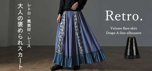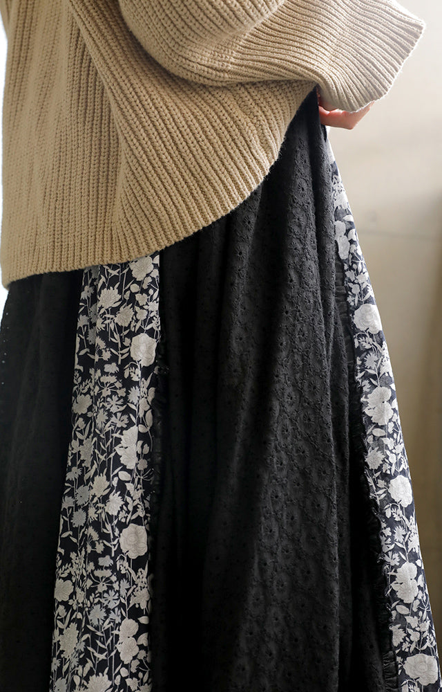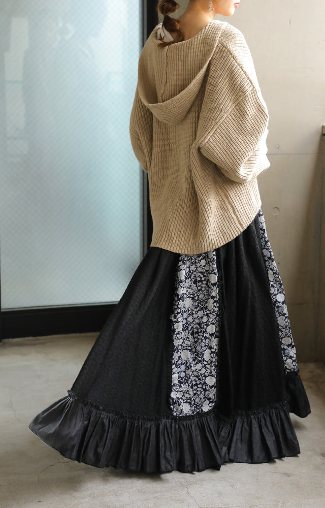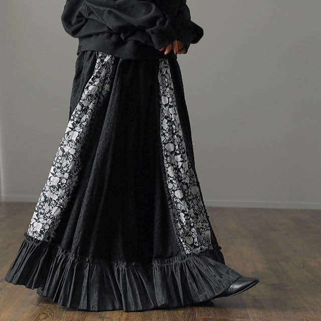ウエストからたっぷりドレープが寄っており贅沢なデザインです。花柄×フリルの組み合わせで甘めのデザインですが、シックな色味なので大人可愛い雰囲気になっております。広めのウエストゴムでトップスをinして着るのもおすすめです。