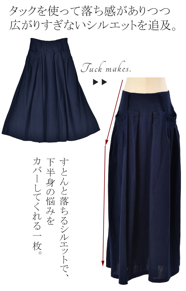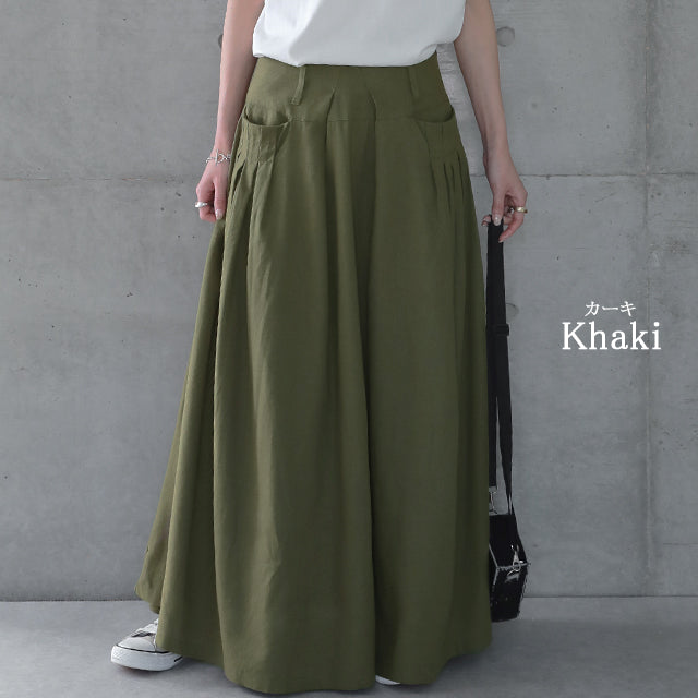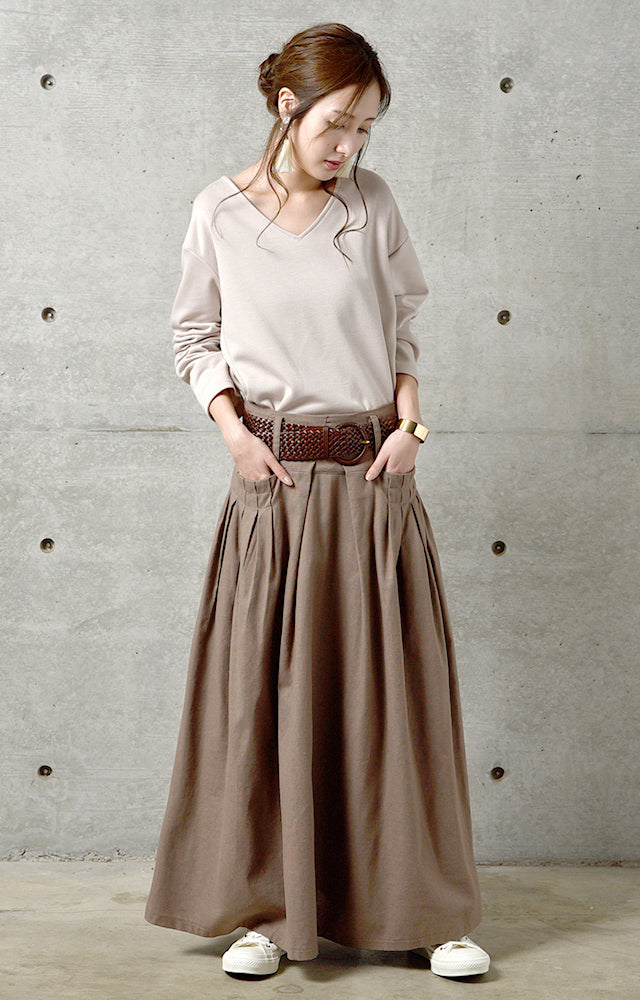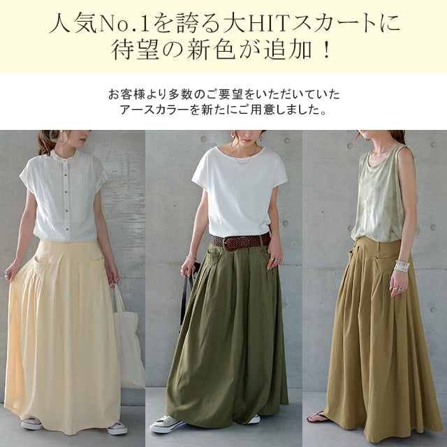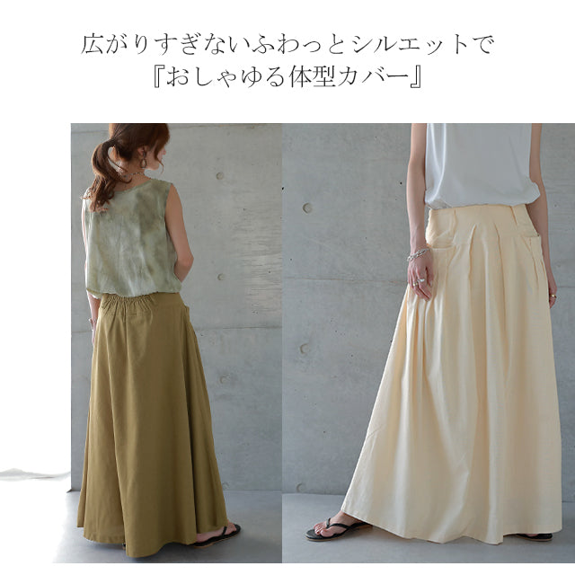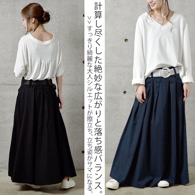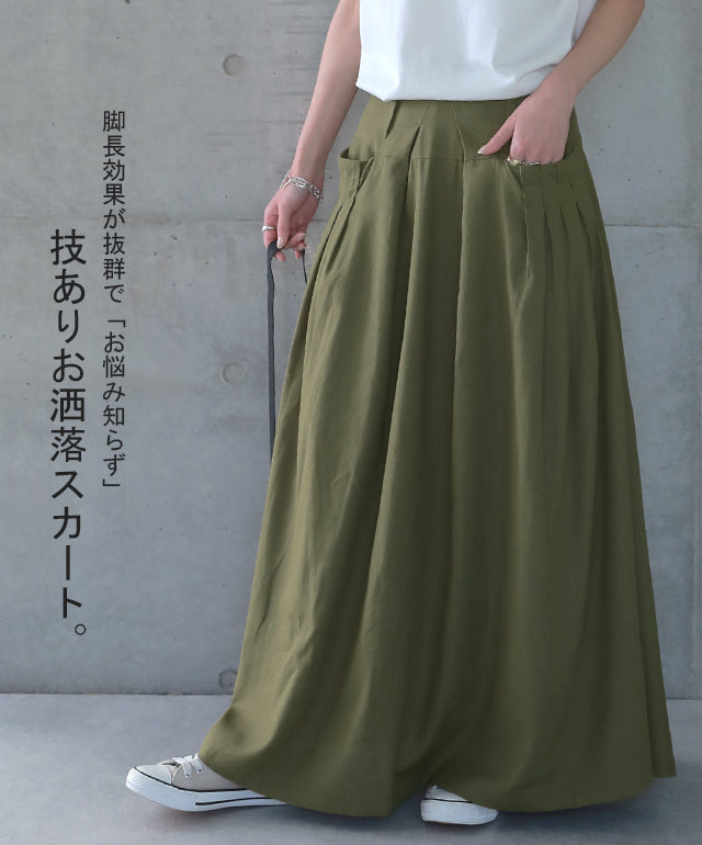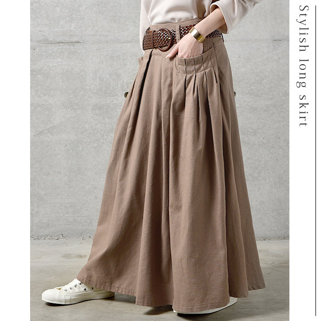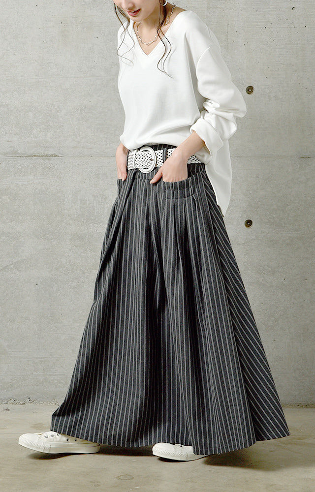 腰回りのデザインがお洒落なロングスカート。ボリュームのあるAラインが下半身を細く見せてくれるので、体型カバーにも効果的です。