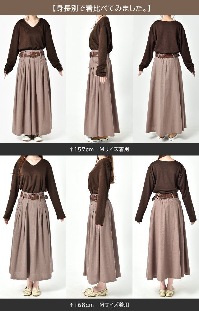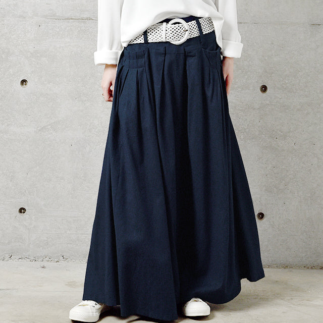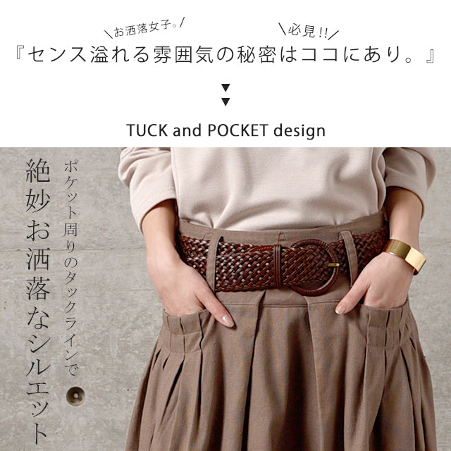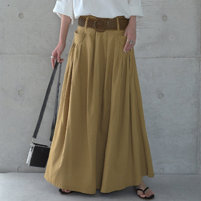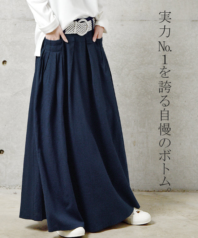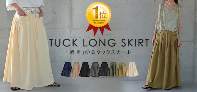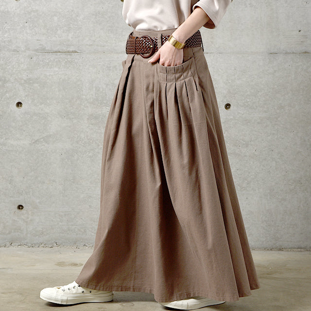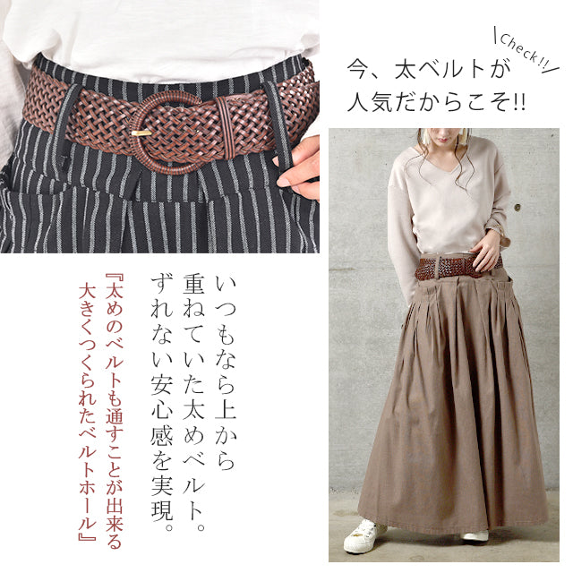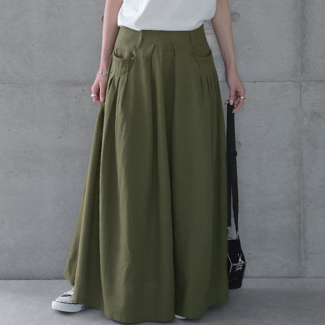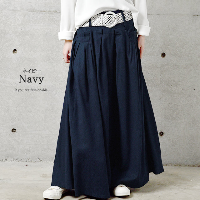 腰回りのデザインがお洒落なロングスカート。ボリュームのあるAラインが下半身を細く見せてくれるので、体型カバーにも効果的です。
