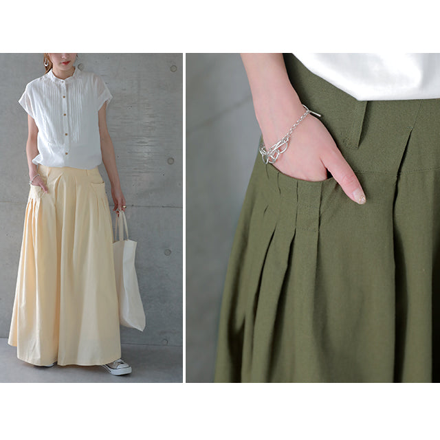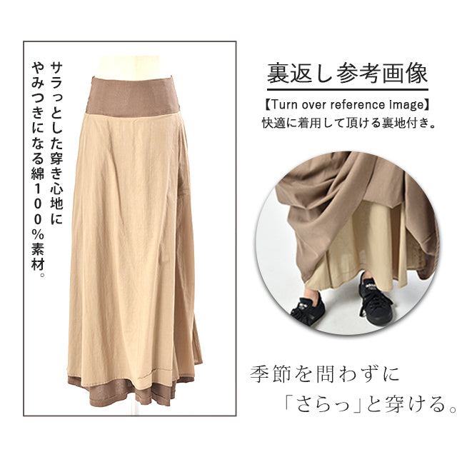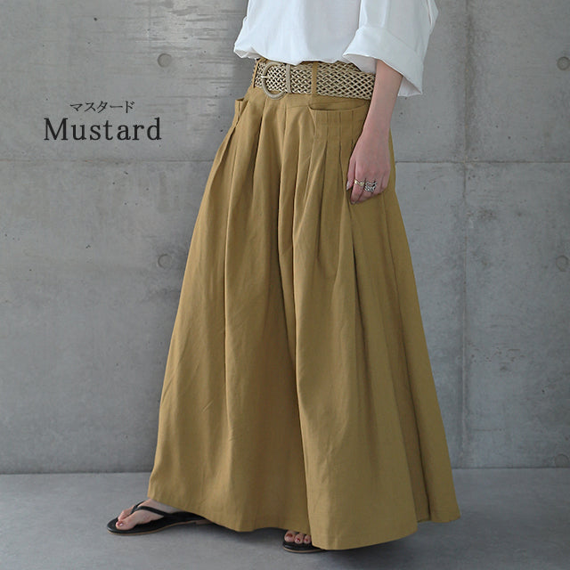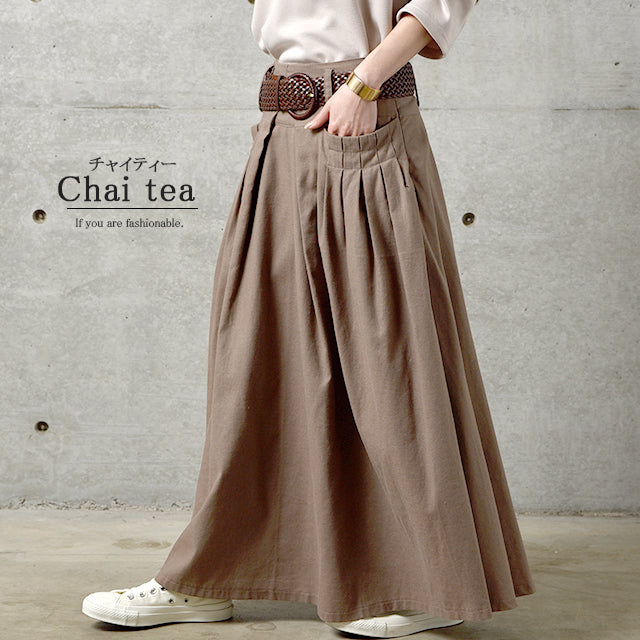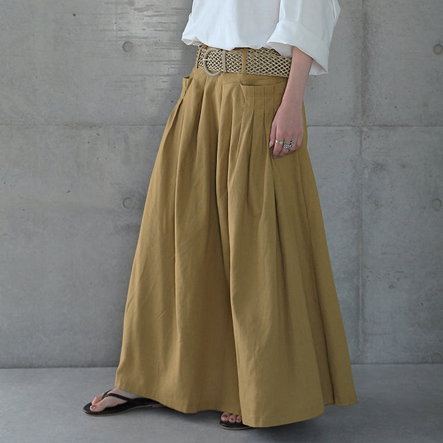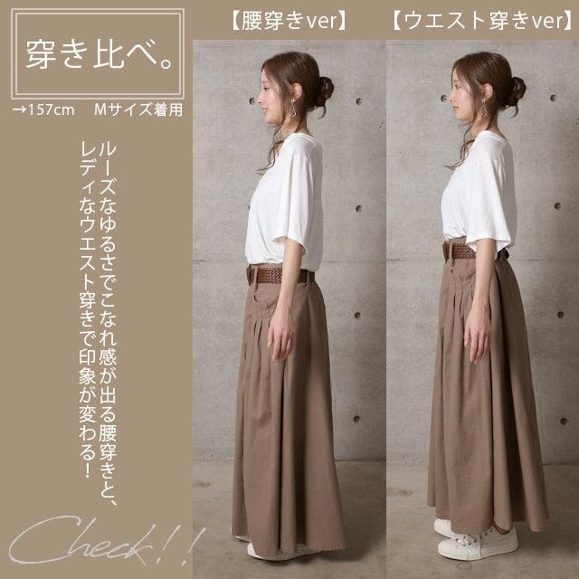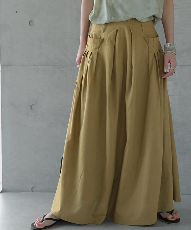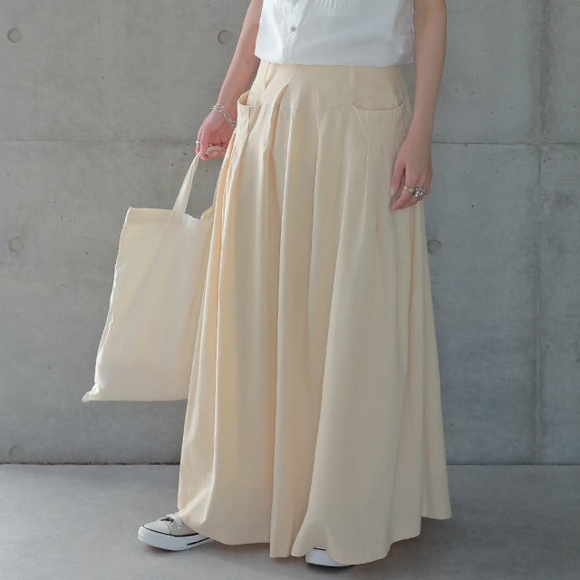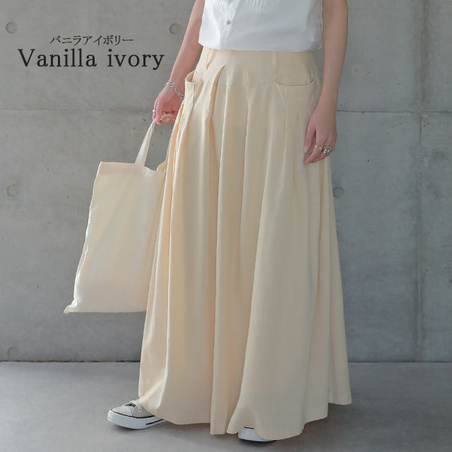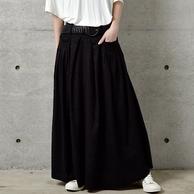 腰回りのデザインがお洒落なロングスカート。ボリュームのあるAラインが下半身を細く見せてくれるので、体型カバーにも効果的です。