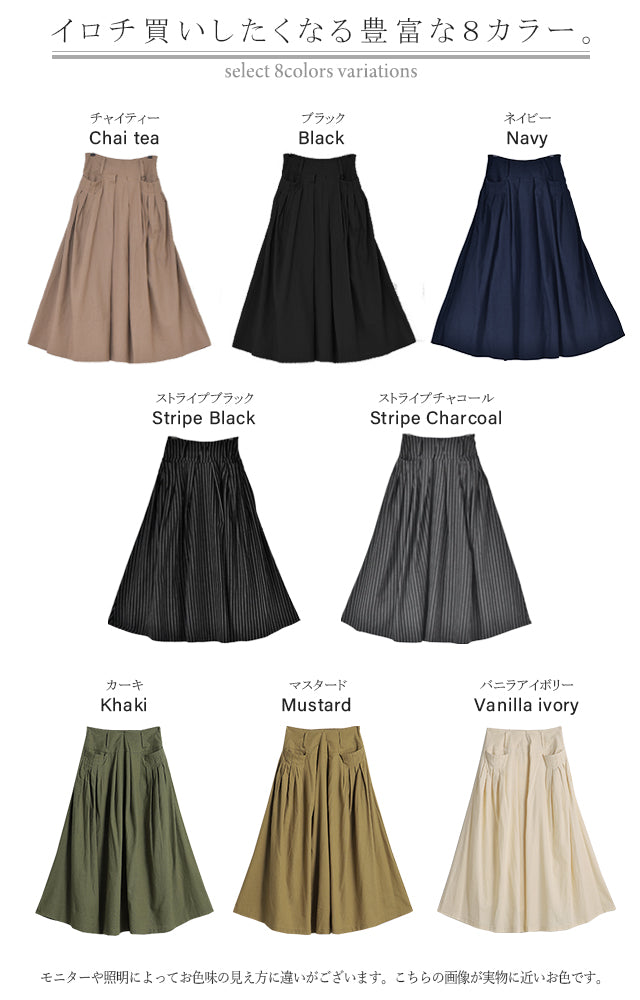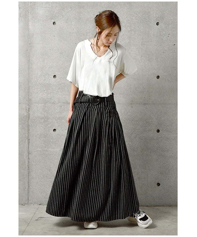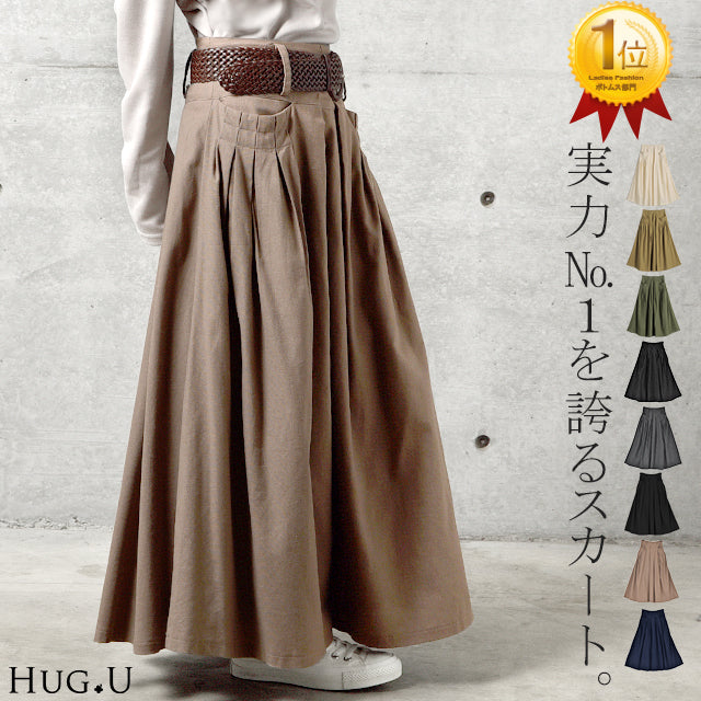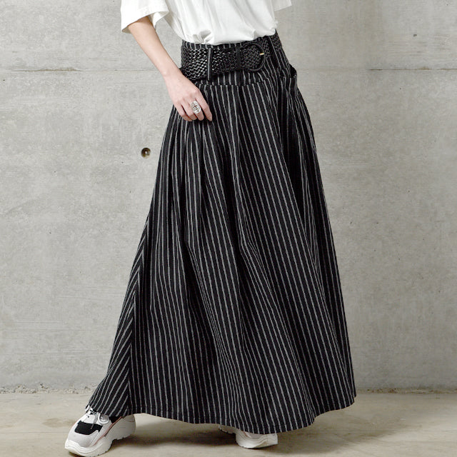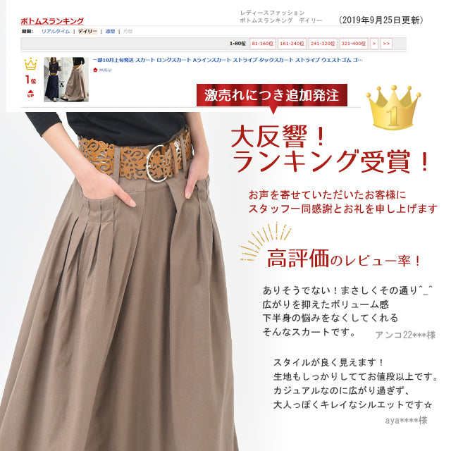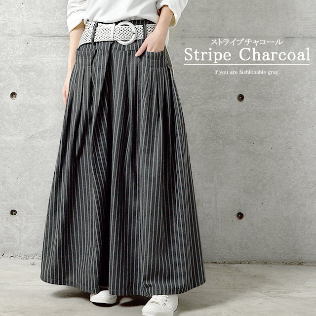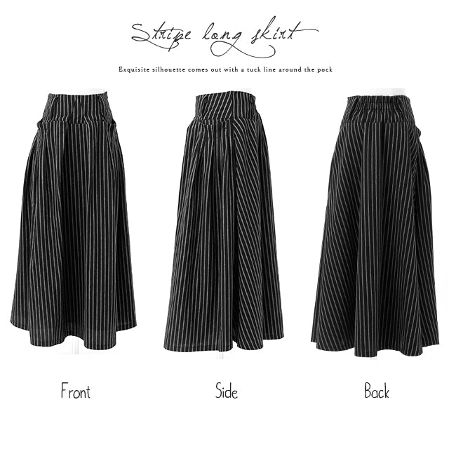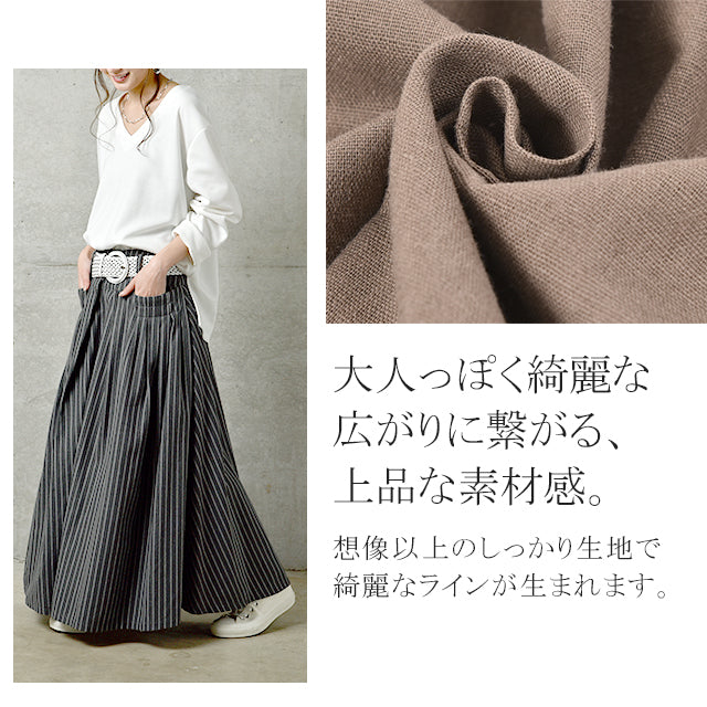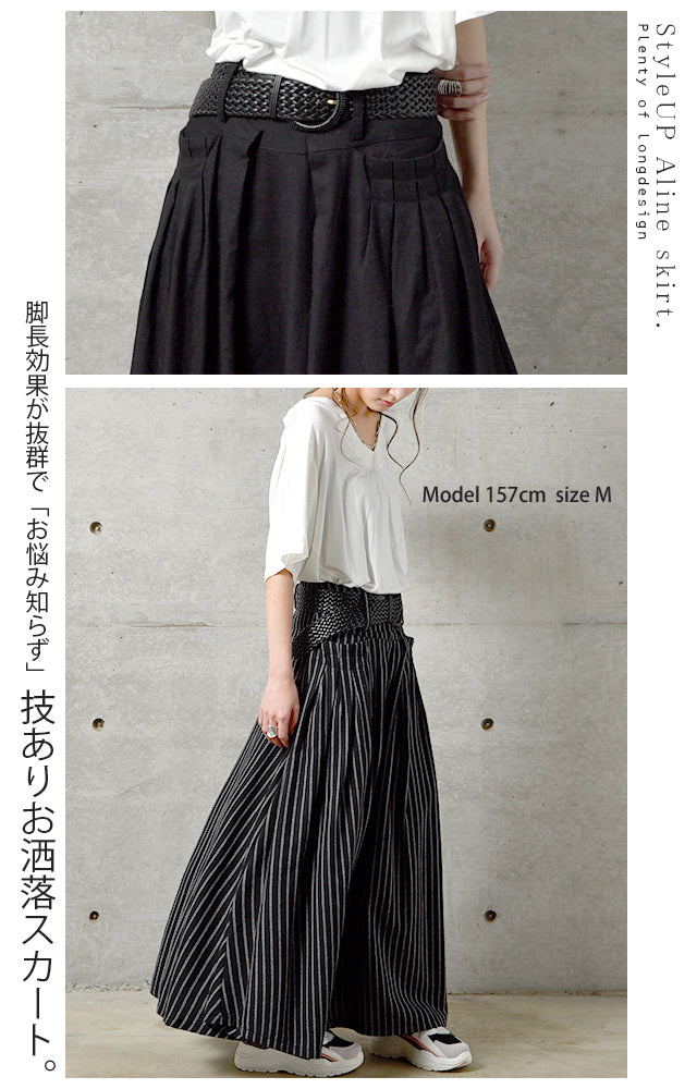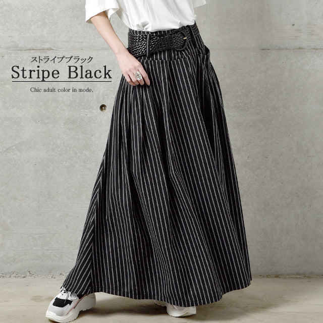 スカート ロングスカート Aラインスカート タックスカート ストライプ ウエストゴム ゴム 大きいサイズ 体型カバー フレアスカート ボトムス フレア ロング マキシスカート マキシ Aライン 春 夏 ベイカー 黒 ベージュ HUG.U