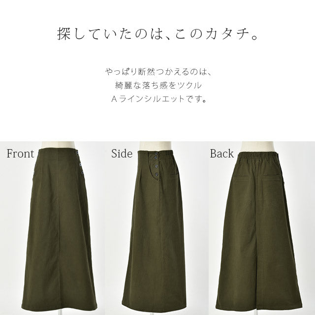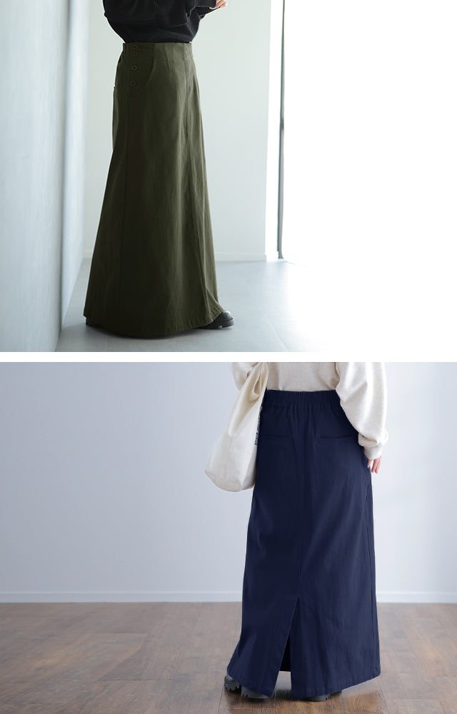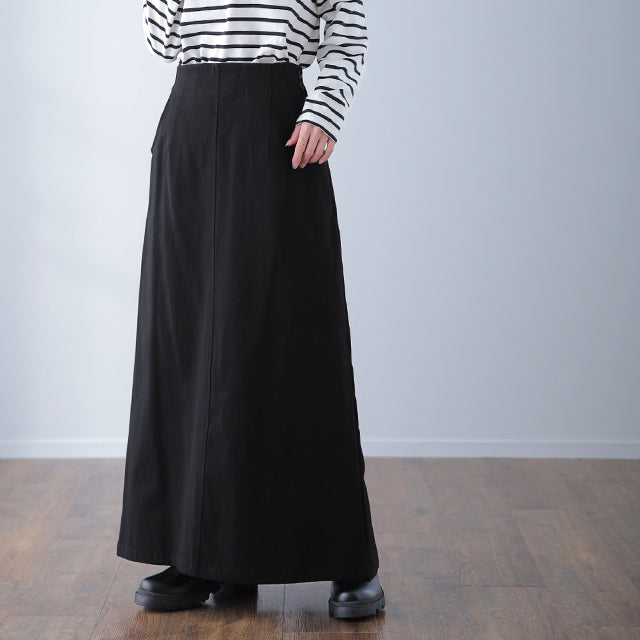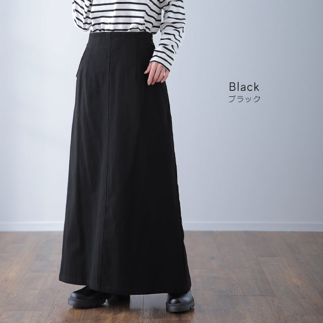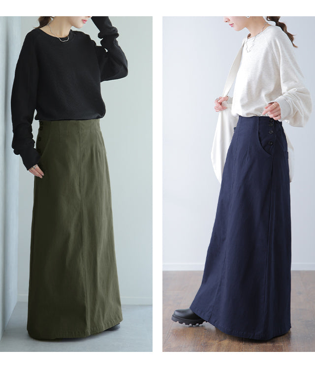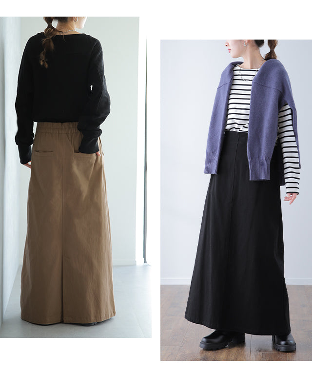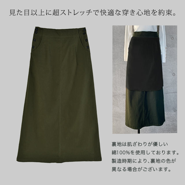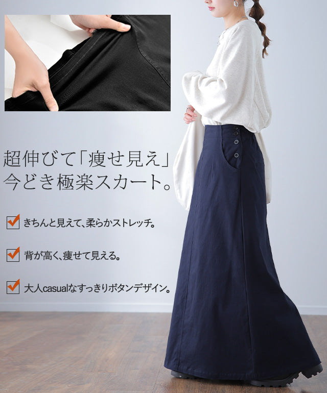 超伸びる!ストレッチがきいた履き心地が気持ちいいロングスカート。ストレスフリーなストレッチ素材なのにトレンドのワークっぽさも取り入れカジュアルスタイルと好相性です。穿きやすいのに上質感もあり、年中使える無敵スカートです。